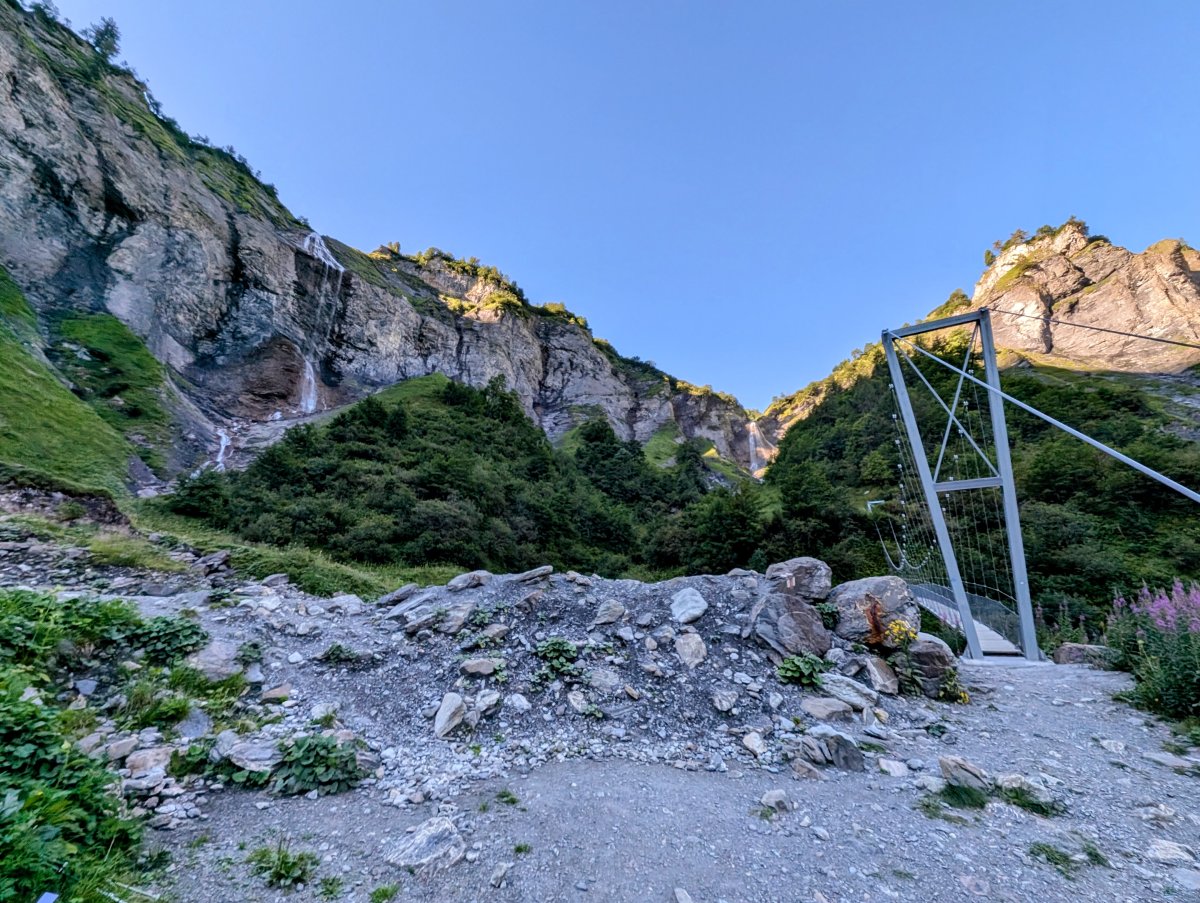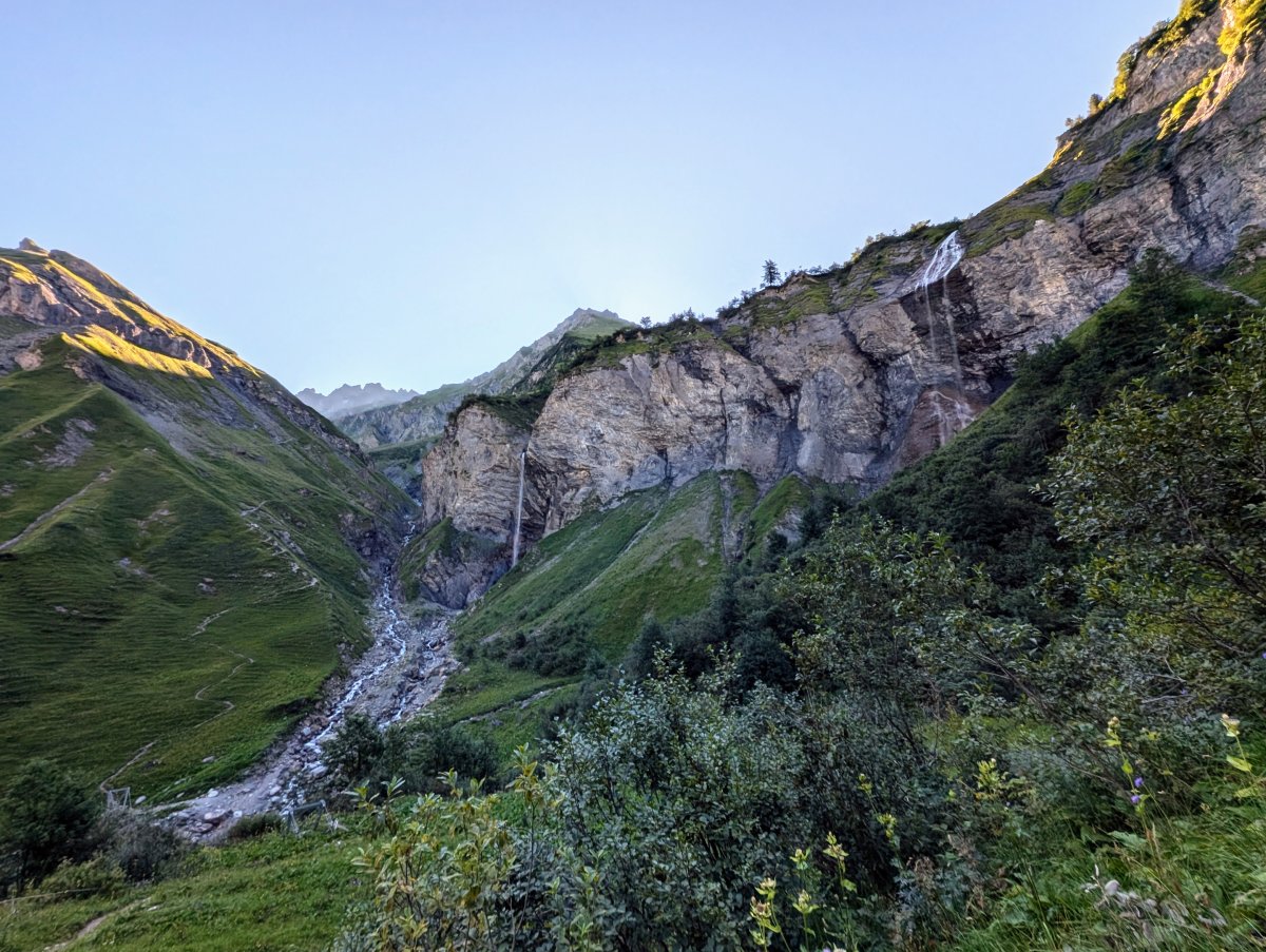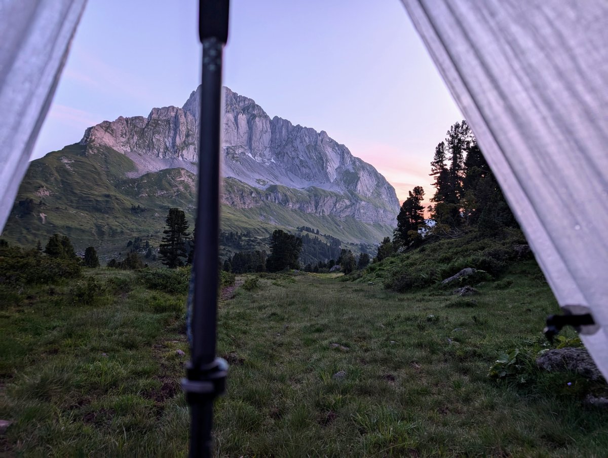 Vor Ort treffe ich das Alpwirtenpaar und tausche mich mit ihnen aus, bis sie mir weiter hinten im Tal eine geeignete Stelle zeigen, wo ich aktuell ihre Landwirtschaft nicht störe und keine Kühe mich in der Nacht überraschen werden. Ich verabschiede mich und sie wünschen mir eine angenehme Nacht.