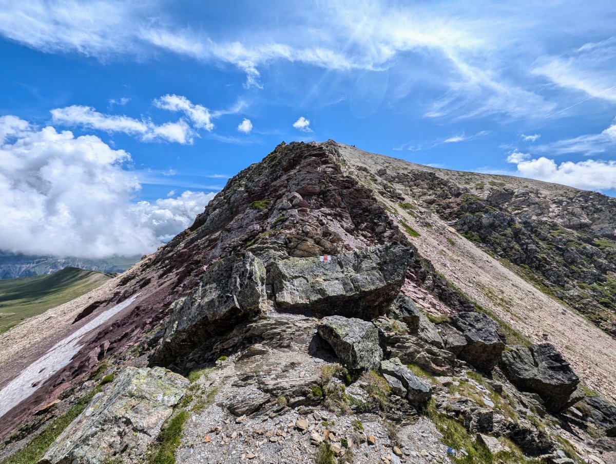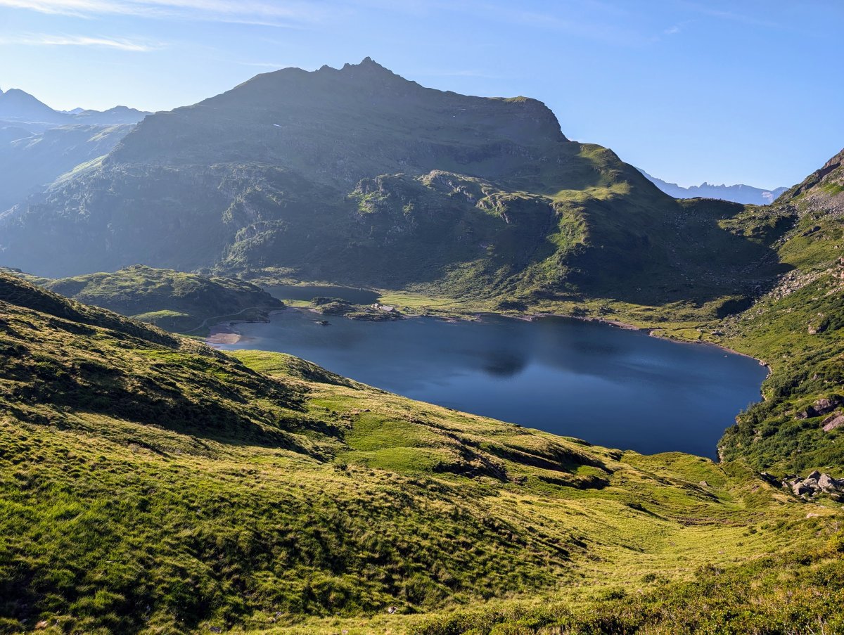 Weiter geht's, vorbei am Heidelpass-See, um den Plattenspitz zum Plattenseeli. Beim Plattenseeli stosse ich auf zwei Trailrunners (Frau und Mann), mit denen ich mich kurz austausche. Sie fragen mich, ob ich die Via Alpina verpasst habe? Ich verneine und sage "Ich bin auf dem Sardona-Weg unterwegs". Darauf meint die Frau "der Sardona sei eh viel schöner als der Via Alpina Abschnitt von Weisstannen bis Elm". Weiter erzählt sie mir, ob ich denn auch die Glaralpina kenne. Die sei auch so schön, doch sehr technisch. Ich antworte ihr: "Diese Route steht auf meiner Liste, ich werde diese in einem anderen Jahr bewandern". Dann überholen sie mich. Weiter vorne stosse ich wieder auf beide und sie weist den Mann an, "so jetzt gehts da lang!" Er schaut mich an und meint "ich laufe einfach ihr nach" und läuft schulterzuckend ihr nach.