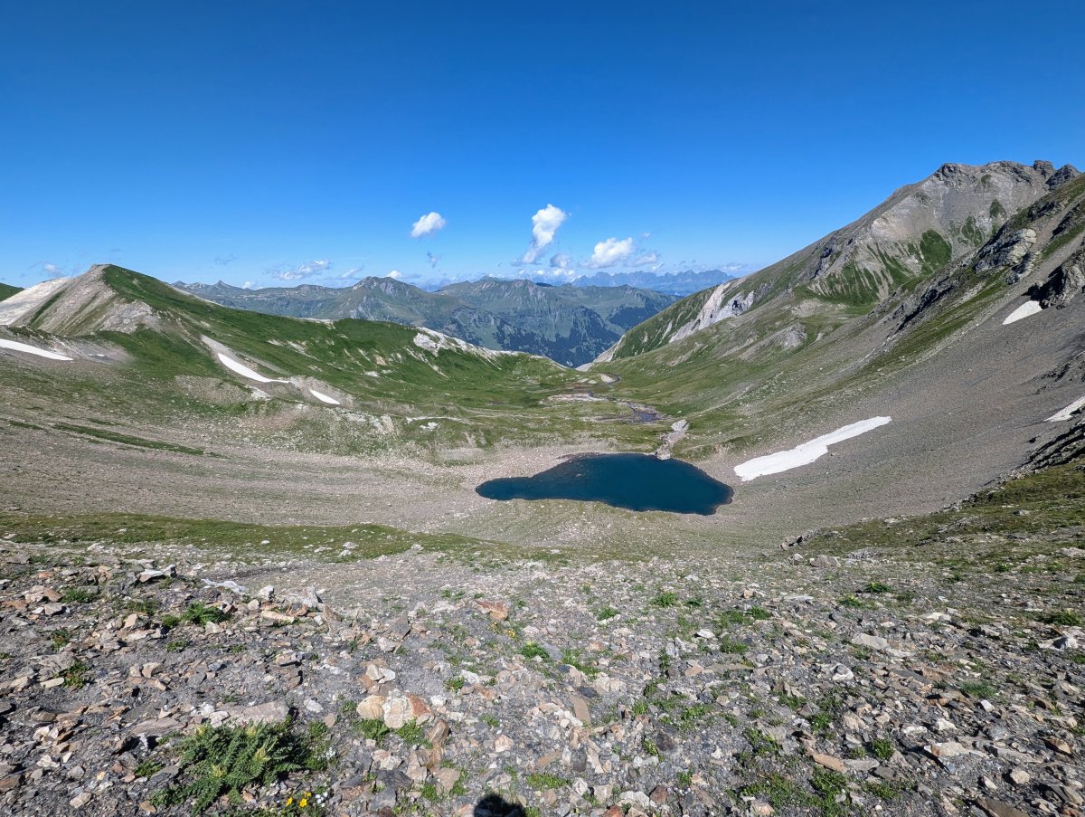 Ich steige weiter auf, auf den Heubützlipass auf 2462 und geniesse die Aussicht und die kühle Brise. Denn bisher ist der Wind eher verhalten. Auf der andere Seite des Passes entdecke ich einen kleinen See. "Woa"! denke ich mir, am liebsten würde ich jetzt dort hinein hüpfen und mich abkühlen, doch ich müsste dazu absteigen und dann wieder aufsteigen.