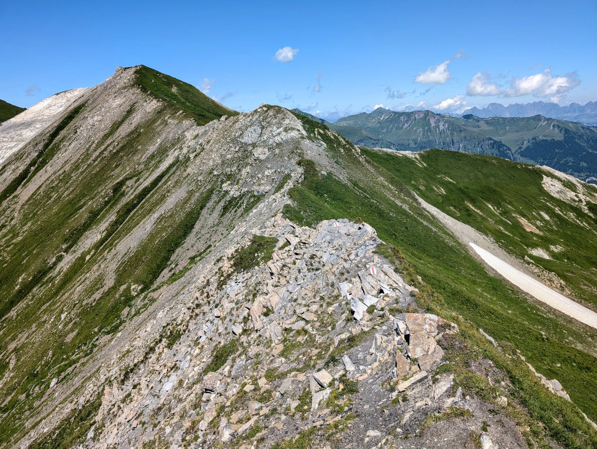 Weiter geht's entlang einem Grat, worauf anschliessend ein Abstieg zur Alp Foo folgt. Beim Abstieg begegnet mir eine ältere Dame und fragt mich, ob ich denn von der Sardonahütte komme und wie weit es denn noch sei. Ich antworte und sage ihr, dass ich nicht von dort komme und die Zeit dorthin nicht kenne, doch beim Heubützlipass habe ich eine Zeitanzeige von 1h50min gesehen. Sie dankt und meint, zu meinem Ziel, dass ich noch über den Foo Pass müsse und dann geht alles abwärts nach Elm. Ich solle dort einen Gruss ausrichten, denn sie sei dort heute Morgen gestartet. Wir wünschen uns eine gute Wanderung und verabschieden uns.