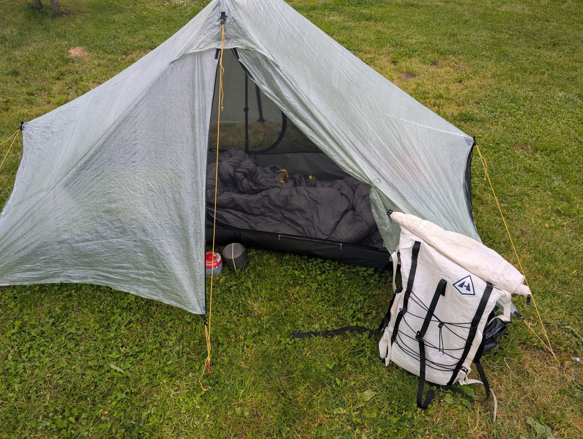 Am Abend entferne ich bereits die ersten zwei Zecken, die es sich bei mir gemütlich machen wollten. Später in der Nacht fängt es an zu regnen und die Temperaturen sinken. Mein Quilt (das ist eine Daunendecke, die zu einem Schlafsack gebunden werden kann) gibt mir zum Glück genügend warm. Der nächste Morgen startet feucht. Es hat die ganze Nacht geregnet, war kalt und beinahe windstill. Dies hat leider dazu geführt, dass mein Zelt nun innen und aussen feucht ist. Aussen vom Regen und innen vom Kondenswasser. Mein Quilt und ich sind jedoch trocken geblieben. Ich packe das nasse Zelt sowie den Rest zusammen und verlasse den Camping früh. Der Weg führt ca. zwei Stunden bergauf auf den Gipfel “Nanos”.