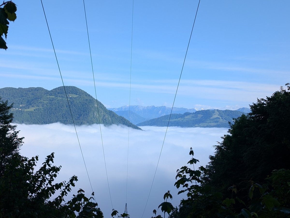Am nächsten Morgen geht's weiter. Zunächst noch durch Idrija und schon bald verlasse ich die Stadt bergauf. Der Weg führt in den Wald. Kurz bevor ich in den Nebel aufsteige, werfe ich noch eine letzten Blick zurück. Dann wird die Luft kühler und feuchter. Nach etwa fünfhundert Höhenmeter Aufstieg, habe ich den Nebel unter mir gelassen und erhasche in einer Waldschneise einen ersten Blick auf den stahlblauen Himmel und das Nebelmeer.