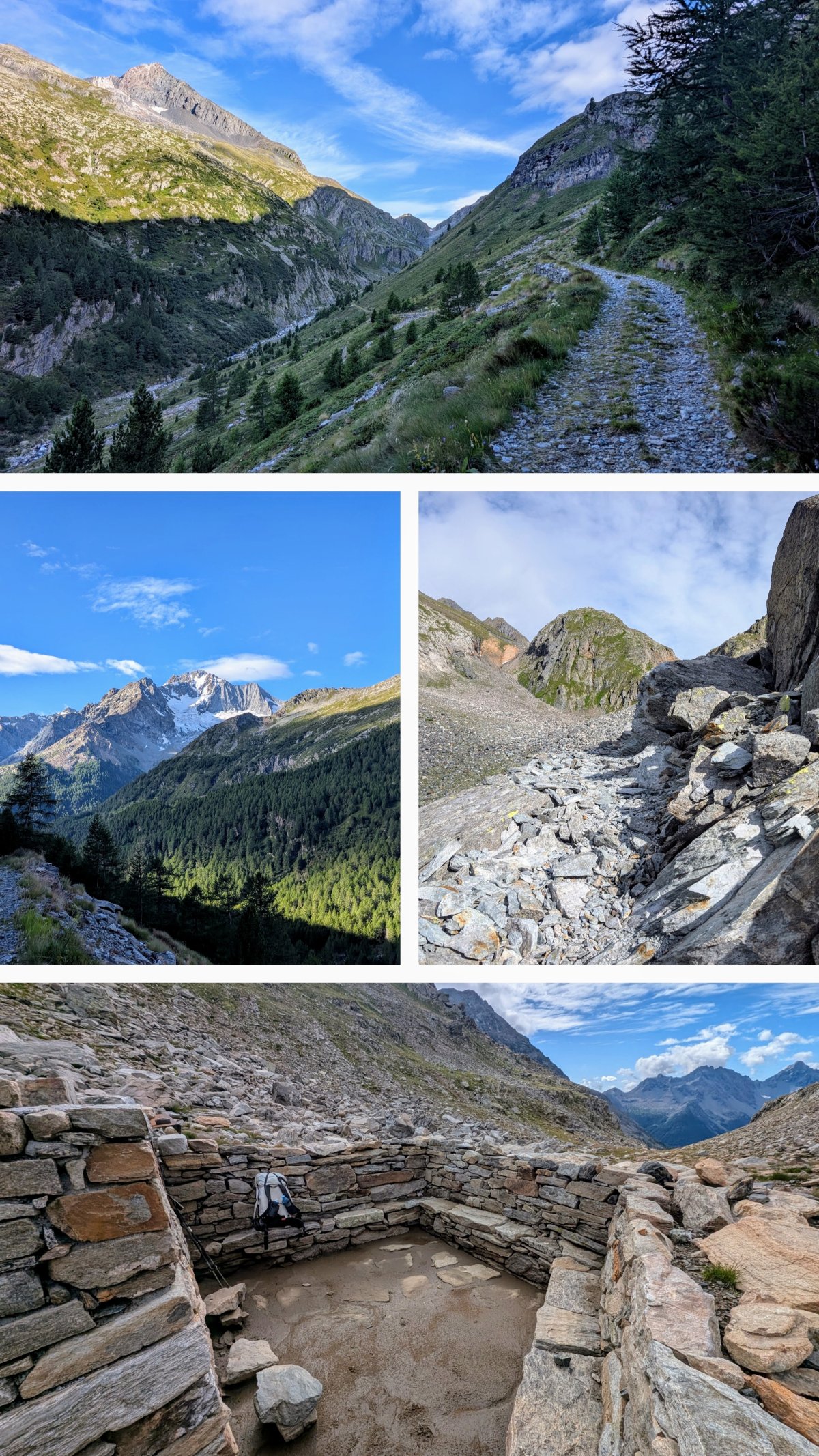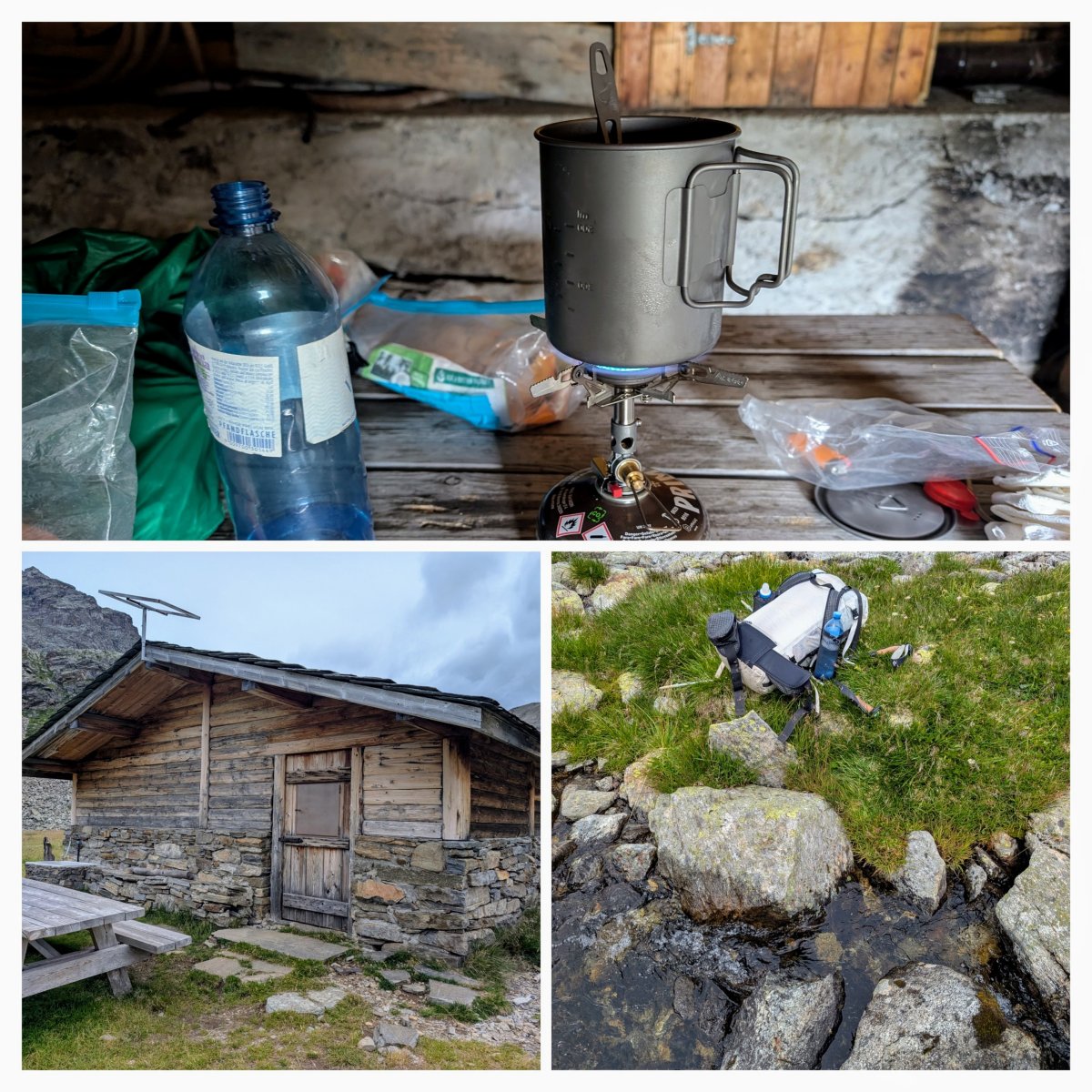 Oben beim Pass ziehe ich ohne Pause direkt weiter und steige wieder ab. Beim Abstieg fülle ich noch rasch meine Wasserreserven auf und kann dann eine knappe Stunde später meinen Mittagsrast einlegen. Ich habe Glück und es bietet sich mir ein altes Biwak an, in dem ich mein Essen zubereiten kann. Denn draussen bläst eine unangenehme Bise und macht einen Rast ungemütlich.