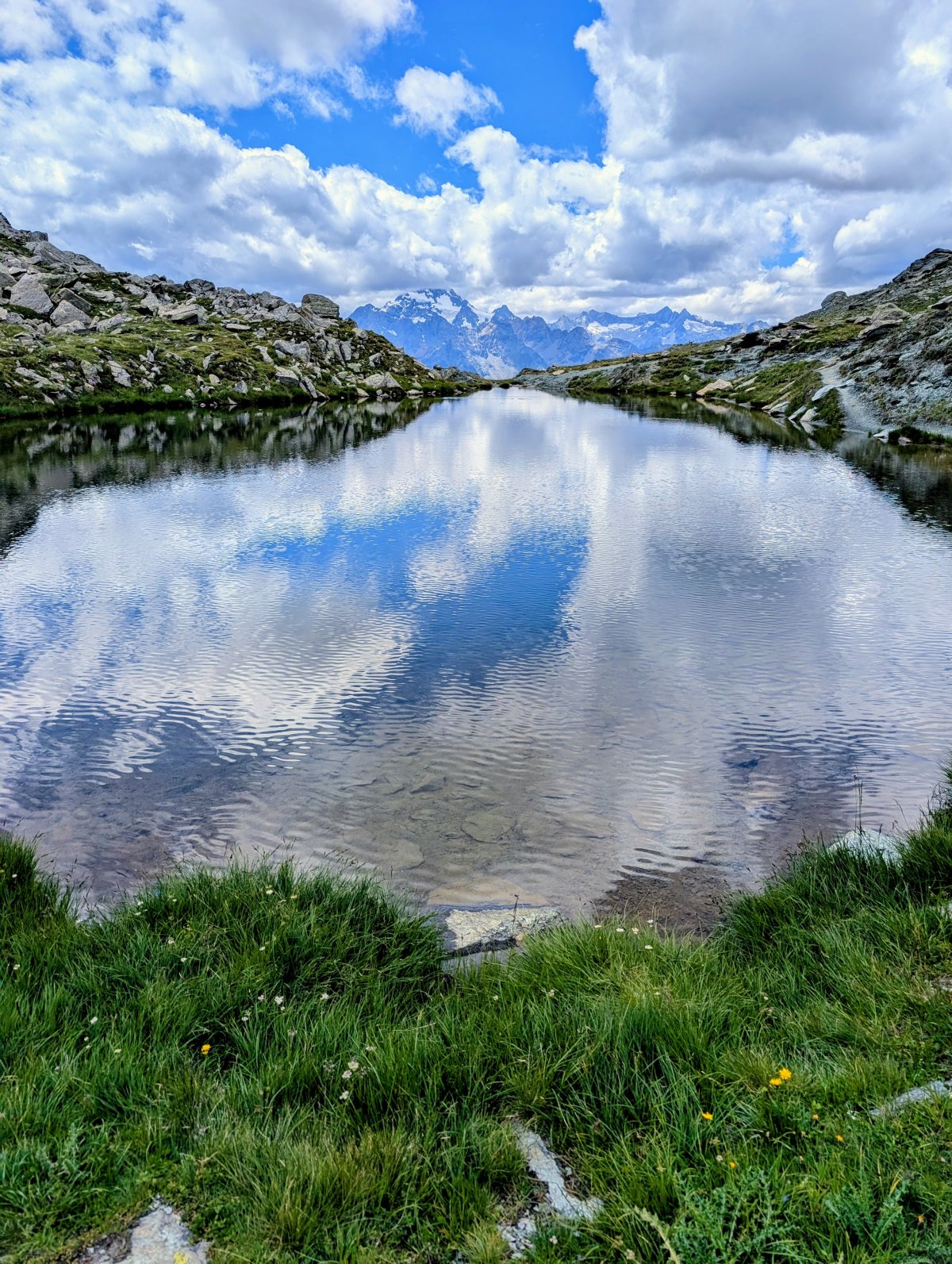 Ich kenne mein heutiges Tagesziel noch nicht genau, doch weiss ich, dass es neunzig Minuten weiter unten zwei Hütten gibt, die zwanzig Gehminuten auseinander liegen. Dort werde ich bei einer um einen freien Platz nachfragen. Auf dem Weg bergab begegne ich glasklaren Bergseen, die bei heissem Wetter sicher einladend für eine Abkühlung sind. Doch heute ist mir das Wetter für ein Bad darin zu kalt, dennoch lege ich an einem einen Rast ein, geniesse den Moment, die Ruhe und den Wind wie er über das Wasser streift