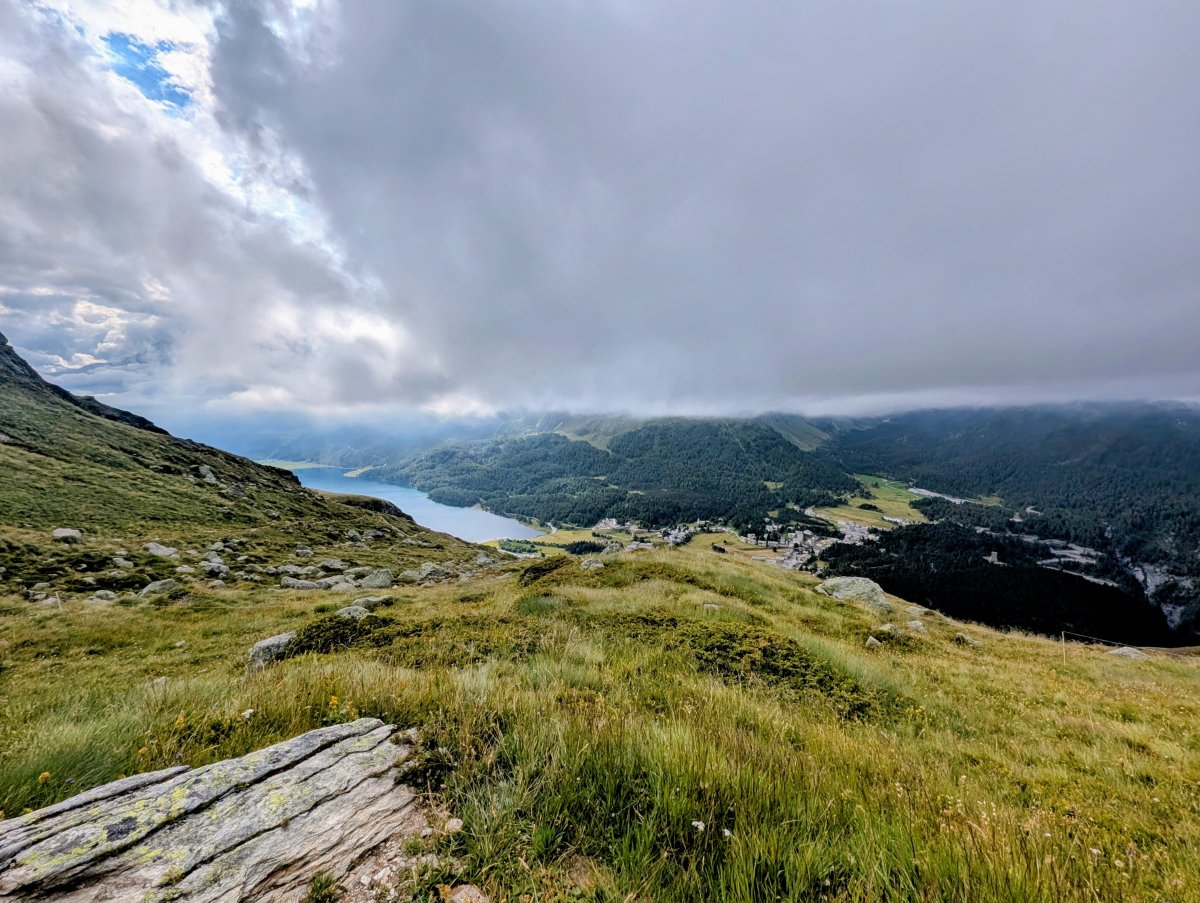 So steige ich weiter zügig auf, entferne mich stetig von Maloja und kann die dunklen, aufziehenden Wolken am anderen Talhang und über dem Silsersee gut beobachten.