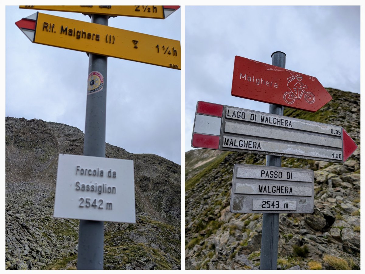 Oben beim Pass auf der Grenze zur Schweiz entdecke ich etwas Verwirrendes. Die italienischen Schilder zeigen an, dass sich hier der “Passo di Malghera” befindet und knapp zwei Meter daneben sind die Schweizer Schilder, die auf einen komplett anderen Namen verweisen. Wurden sich hier die Italiener und Schweizer nicht einig, oder hat der Pass tatsächlich zwei Namen? Ich weiss es leider bis heute nicht!