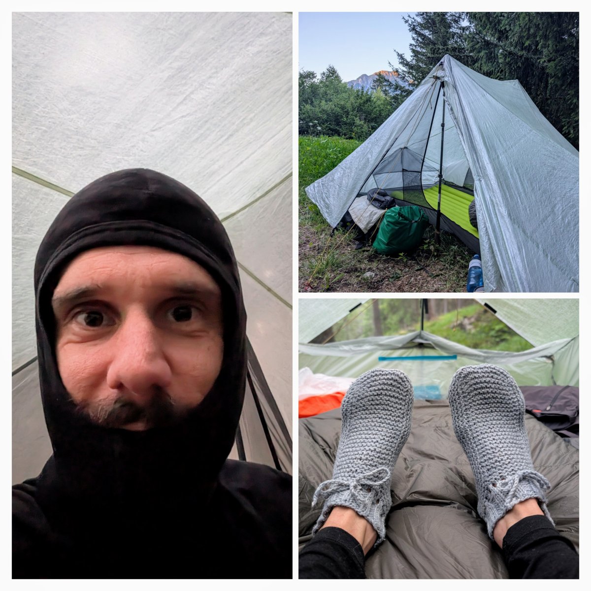 Die Nacht wird kühl und so ziehe ich mir meine Sturmhaube an, so dass ich am Kopf in der Nacht nicht auskühle. Denn die anderen Körperteile sind ja bedeckt. Als kleinen Luxus habe ich sogar handgestrickte Bettsocken aus Wolle dabei. Die Grossmutter von Doris hat mir extra welche für meine Via-Alpina gestrickt. Dabei hat sie tatsächlich darauf geachtet, dass diese auch in meine ultraleichte Ausrüstung passt. So hatte ich dank den Socken bisher noch nirgends, weder im Zelt noch in Hütten, kalte Füsse.