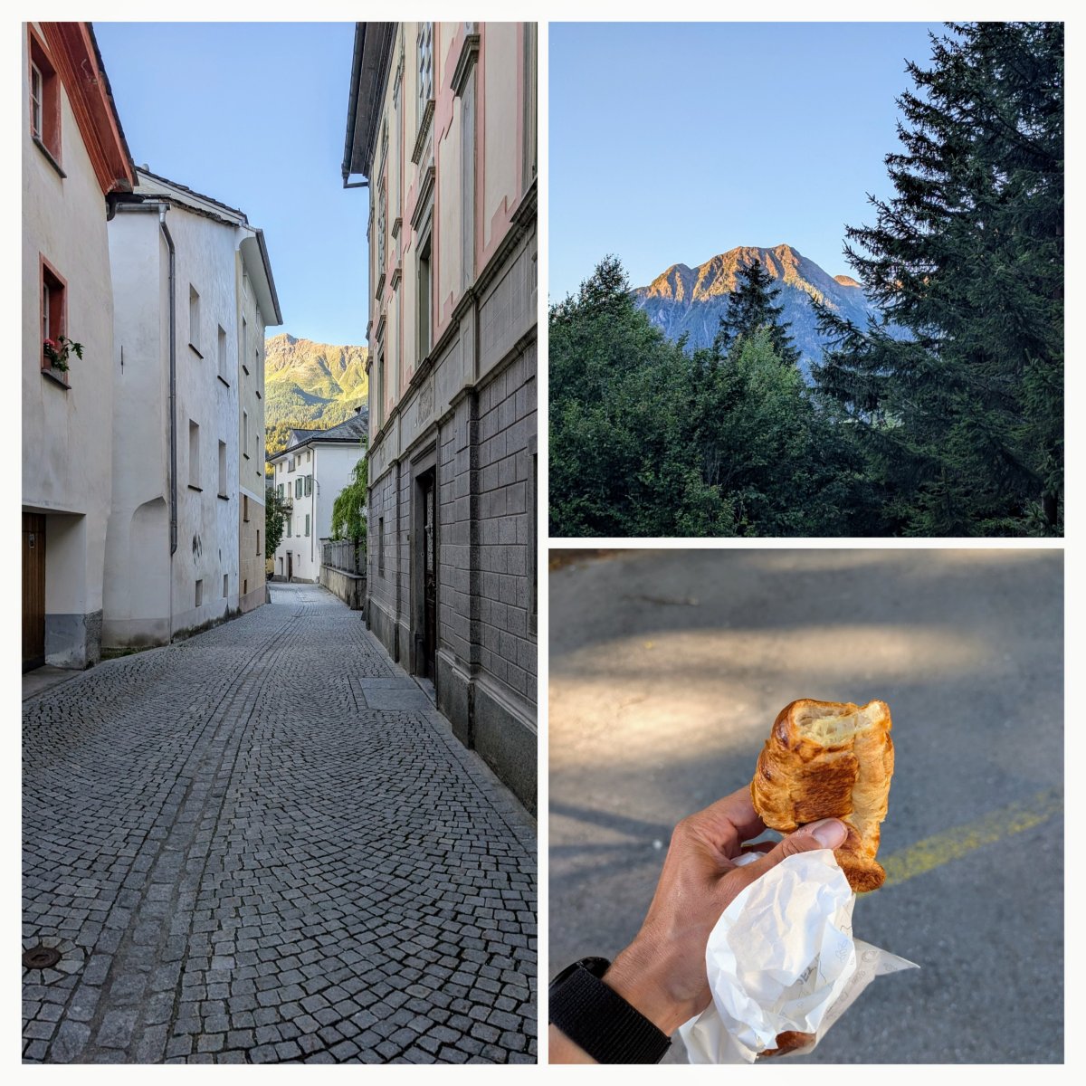 Etwas mehr als eine Stunde später bin ich bei wunderbarem Wetter unterwegs nach Poschiavo hinab. Bergab telefoniere ich und gönne mir unten spontan wieder einmal ein knuspriges “Gipfeli”.