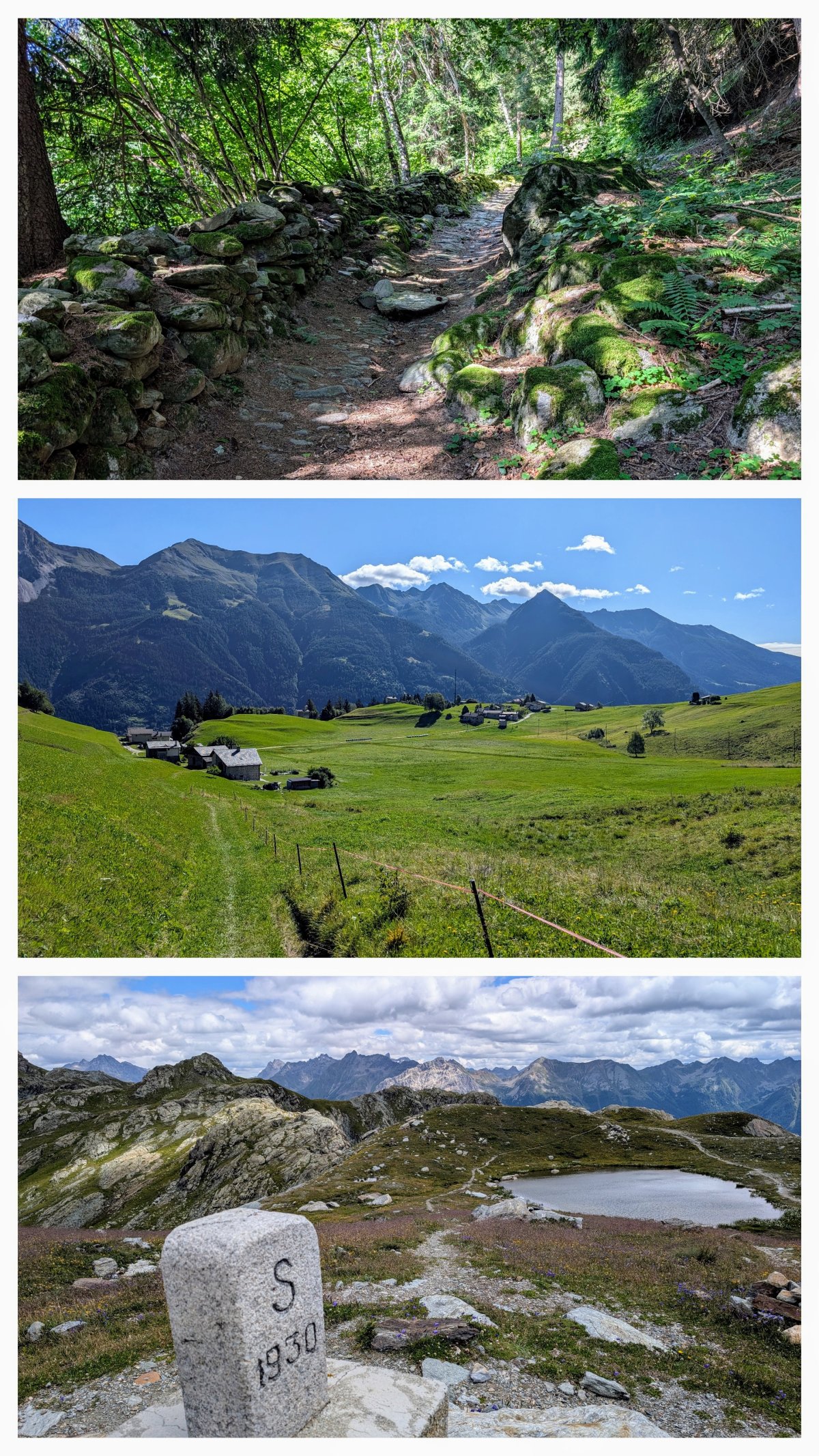 Das Wetter spielt perfekt mit und so führen mich die Wege zuerst durch Wald, dann über Alpwiesen und später über alpines Ödland. Gute vier Stunden später bin ich dann oben und überschreite wieder die Grenze zu Italien.