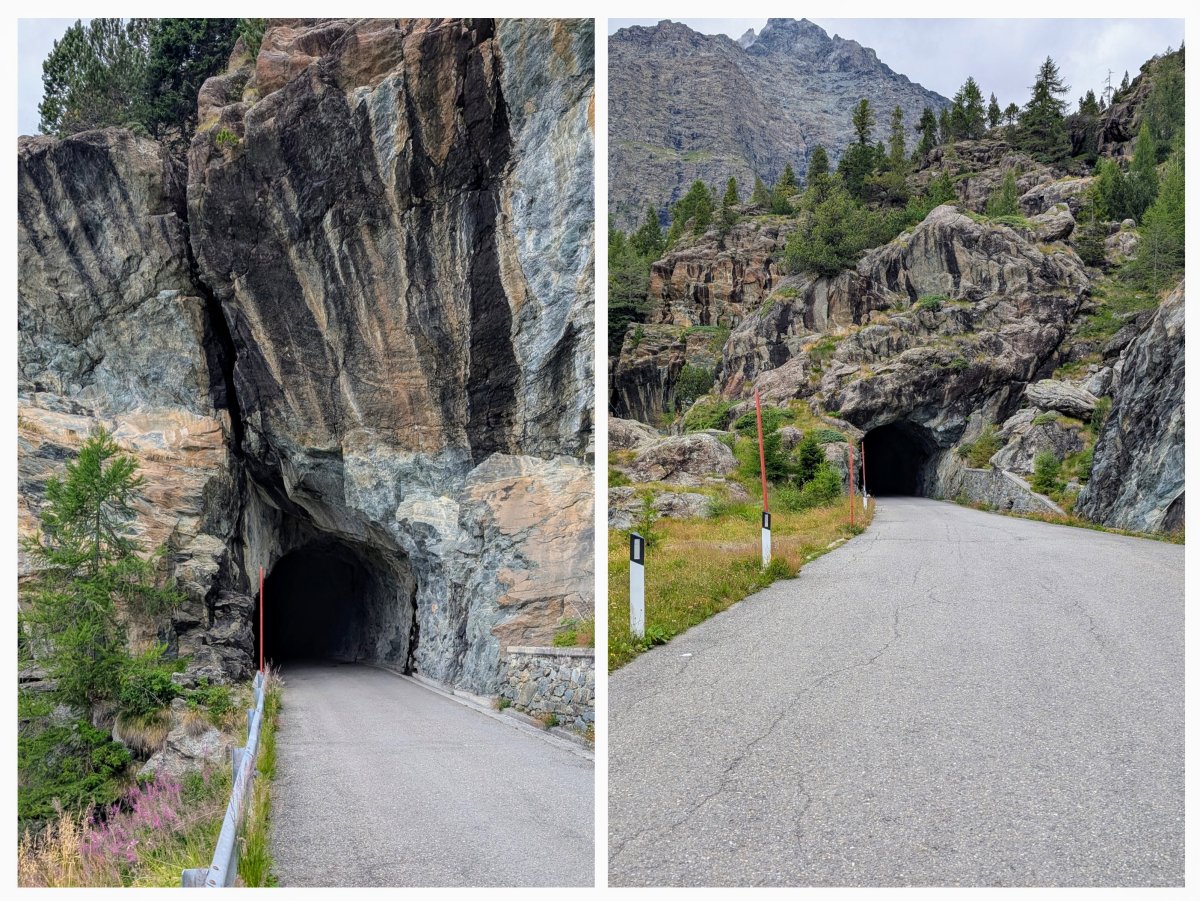 Nach vierzig Minuten Abstieg merke ich, dass ich die falsche Abzweigung genommen habe. Normalerweise signalisiert mir dies meine Uhr akustisch und haptisch, doch leider habe ich dies wohl irgendwie verpasst. So plane ich kurzerhand um und nehme die asphaltierte Strasse, die durch sieben Tunnel zurück auf meinen ursprünglichen Trail führt.