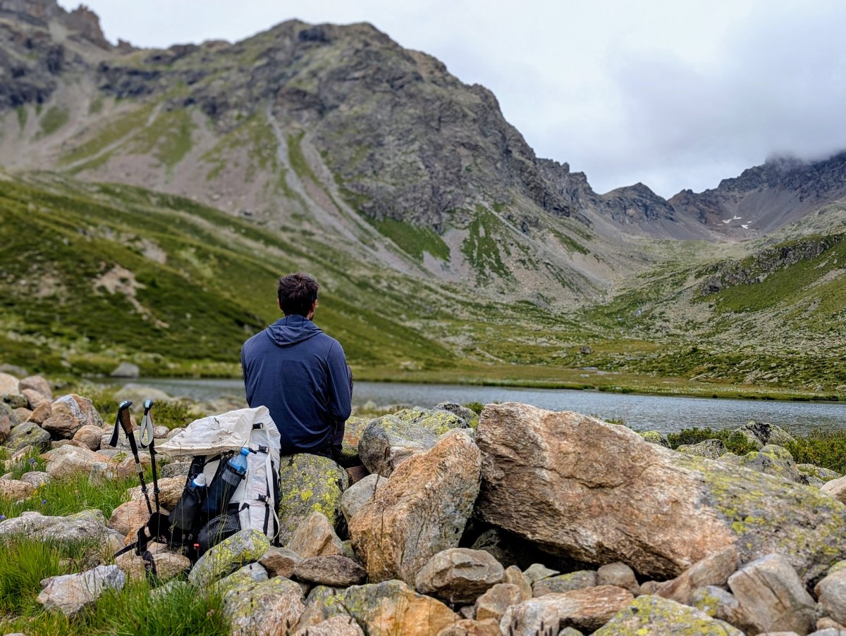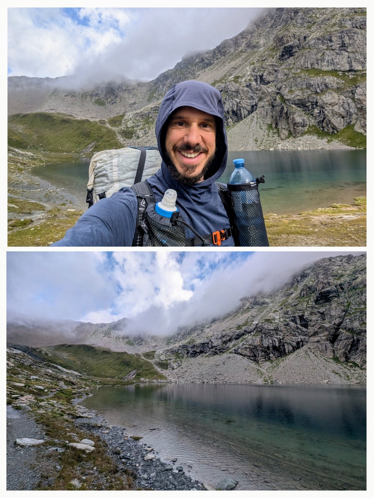 Ich kenne mein heutiges Tagesziel noch nicht genau, doch weiss ich, dass es neunzig Minuten weiter unten zwei Hütten gibt, die zwanzig Gehminuten auseinander liegen. Dort werde ich bei einer um einen freien Platz nachfragen. Auf dem Weg bergab begegne ich glasklaren Bergseen, die bei heissem Wetter sicher einladend für eine Abkühlung sind. Doch heute ist mir das Wetter für ein Bad darin zu kalt, dennoch lege ich an einem einen Rast ein, geniesse den Moment, die Ruhe und den Wind wie er über das Wasser streift.