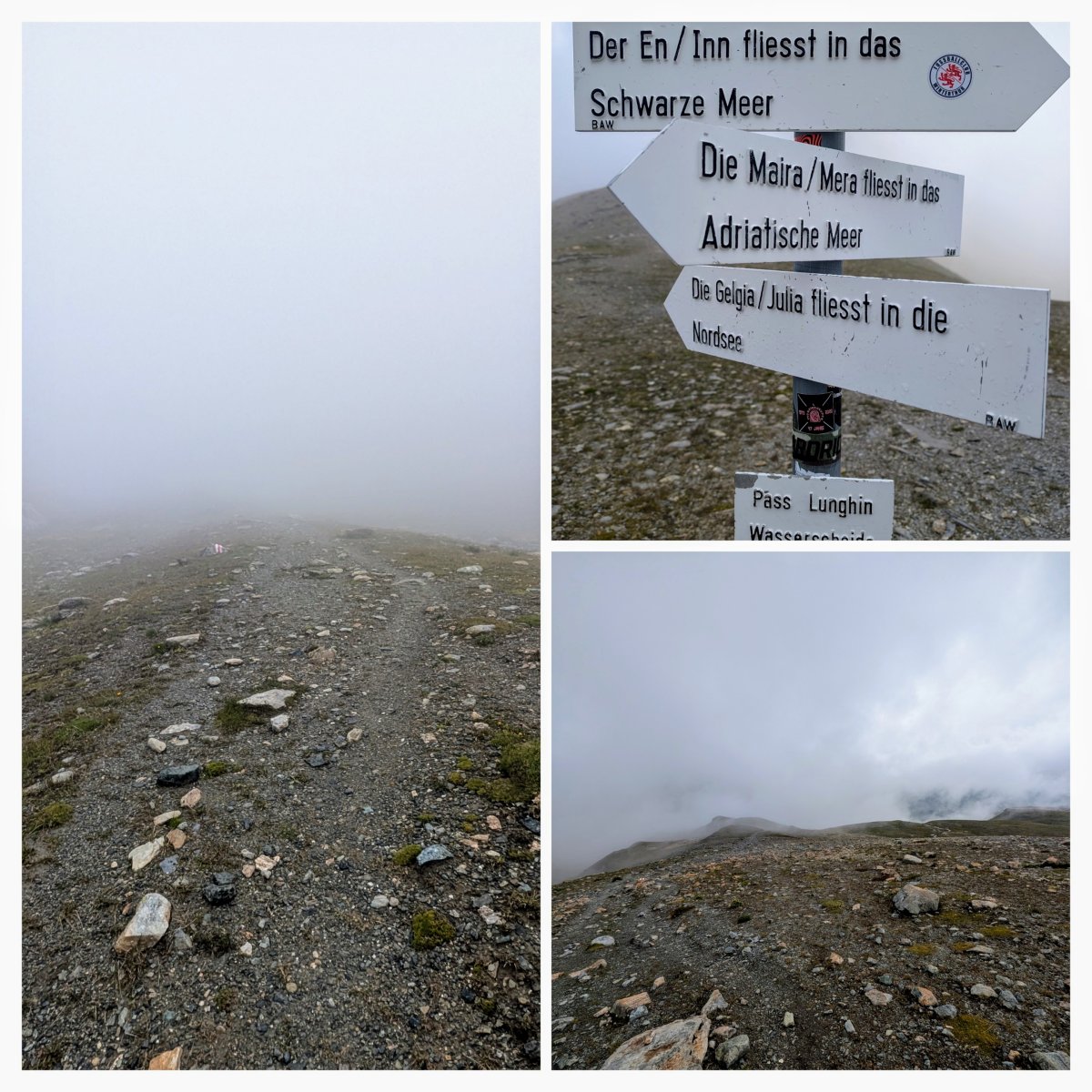 Oben auf dem Pass, auf über zweitausend sechshundert Meter über Meer, trübt der Nebel die Weitsicht. Da ich keine Weitsicht habe, liegt meine Aufmerksamkeit auf dem Naheliegenden. Dabei entdecke ich eine Wasserscheide, bei der das Wasser in drei verschiedene Meere fliessen kann, je nachdem, wo es auf den Boden trifft.