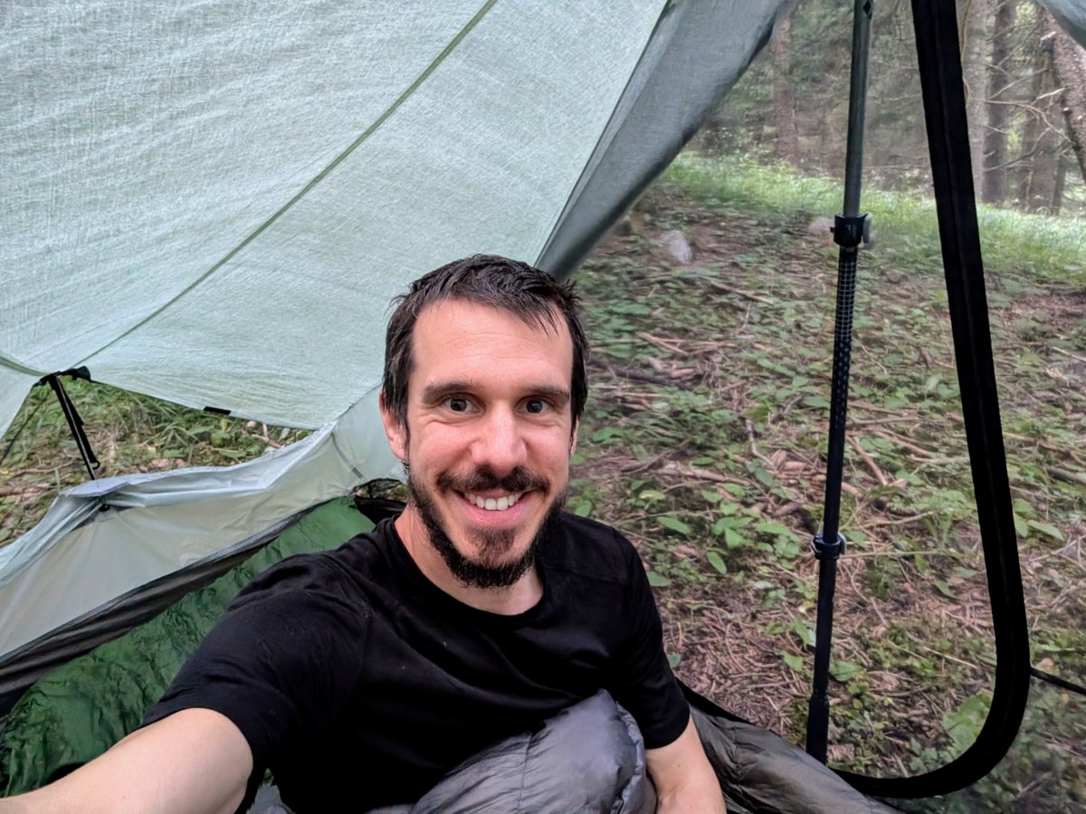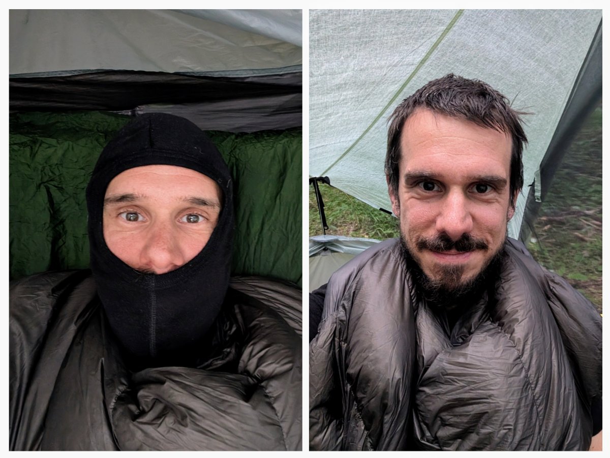 Kurz nach Sonnenuntergang ziehe ich mich ins Zelt zurück, denn es beginnt leicht zu regnen. Ich bereite mich auf eine kalte Nacht vor. Denn die Temperaturen sinken hier auf knapp zweitausend Meter über Meer in der heutigen Nacht auf rund vier Grad. Dies ist gerade knapp noch die Komfort-Temperatur meines Quilts. Damit er in der Nacht nicht verrutscht und ich nicht zu frieren beginne, befestige ich ihn um die Isomatte und um meinen Hals und ziehe zudem meine warmhaltende Schlafkleidung an. Der Regen wird später stärker, doch irgendwann schlafe ich trotz des prasselnden Regens zufrieden ein.
