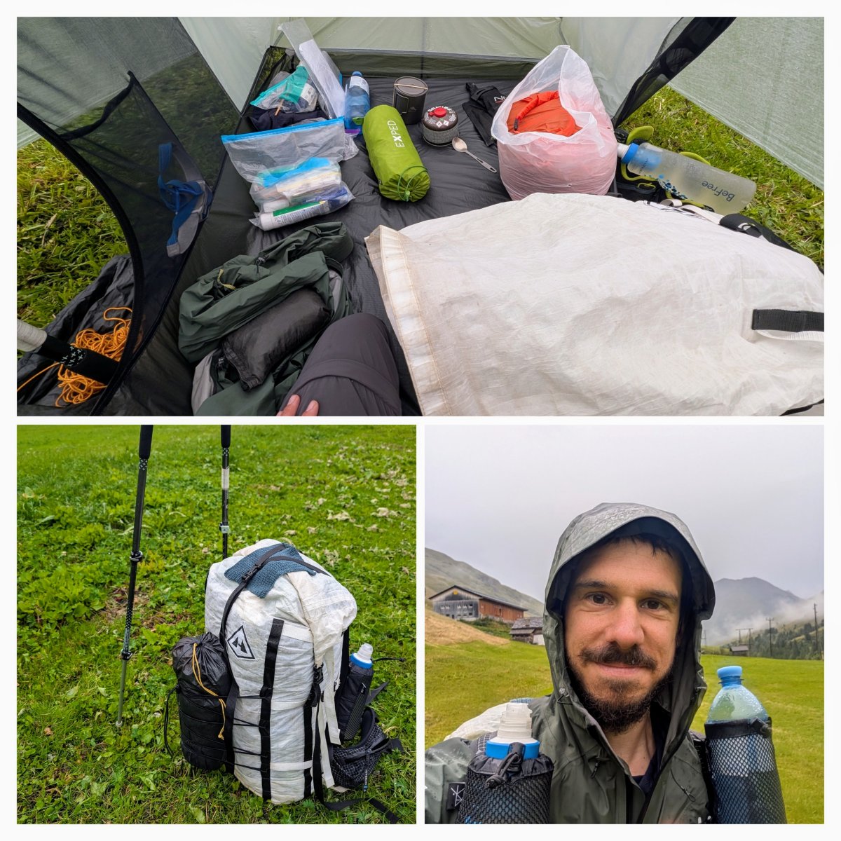 Die Nacht war tatsächlich sehr kalt, doch ich hatte glücklicherweise warm und so fand ich auch einen erholsamen Schlaf. Ich beginne zu frühstücken und starte meine morgendliche Routine. Wetter checken, Route ansehen, Wasserstellen bestimmen und vieles mehr. Leider regnet es immer noch und es wird bis mittags auch so bleiben. So packe ich heute meinen Rucksack bereits im Zelt. Zum Schluss folgt natürlich auch noch das Zelt selbst, welches ich heute ausnahmsweise aussen am Rucksack befestige. Denn es kommt mir nichts Nasses in den Rucksack. Trotz Regen starte ich motiviert und wandere leichtfüssig talwärts.