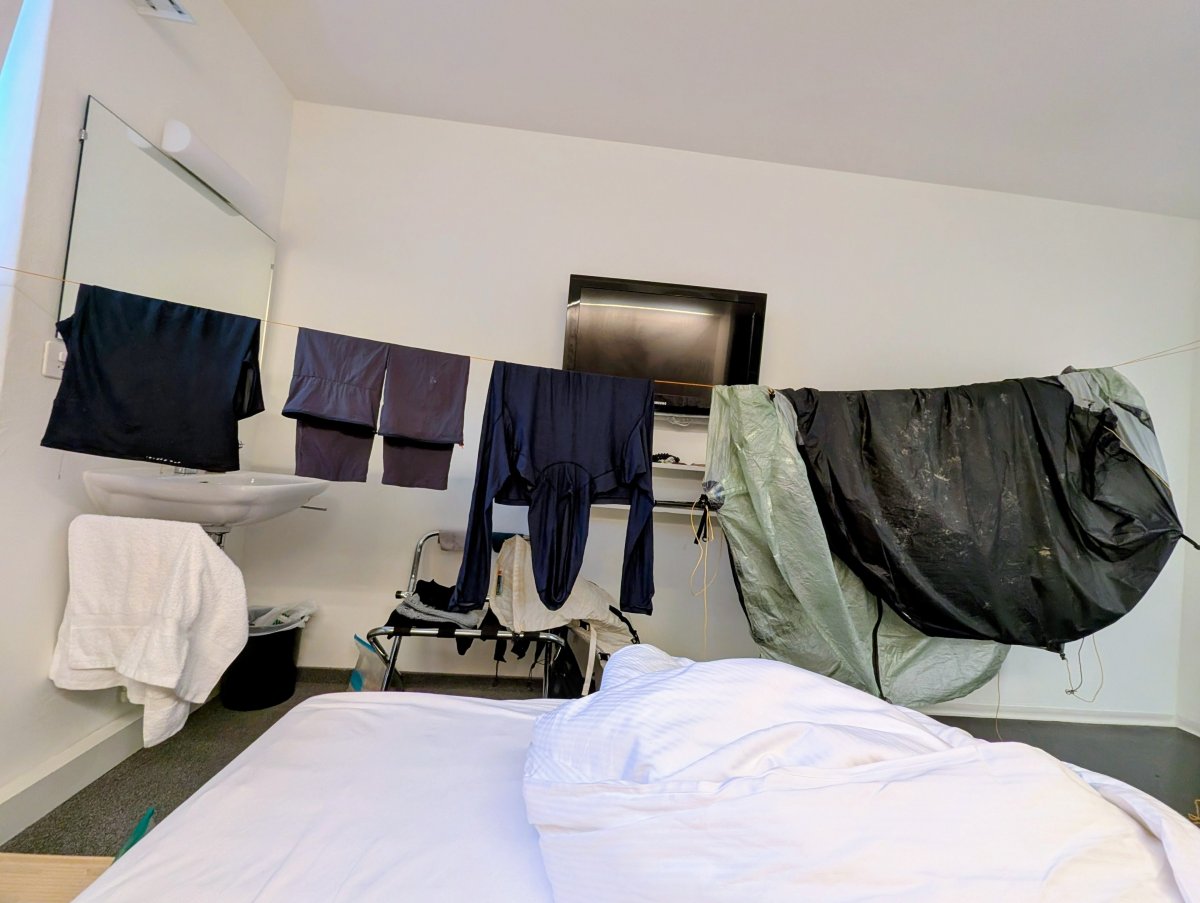 In Innerferrera erwische ich knapp noch das Poschi nach Thusis, ansonsten hätte ich eine Stunde auf das Nächste warten müssen. In Thusis checke ich im Hotel ein, nehme eine Dusche und gehe einkaufen. Am Abend packe ich mein Zelt aus und bastle aus einer Reepschnur behelfsmässig eine Wäscheleine, um mein Zelt und die gewaschenen Kleider im Zimmer zu trocknen. Zum Nachtessen gibt's heute Reste aus meinem Vorrat.