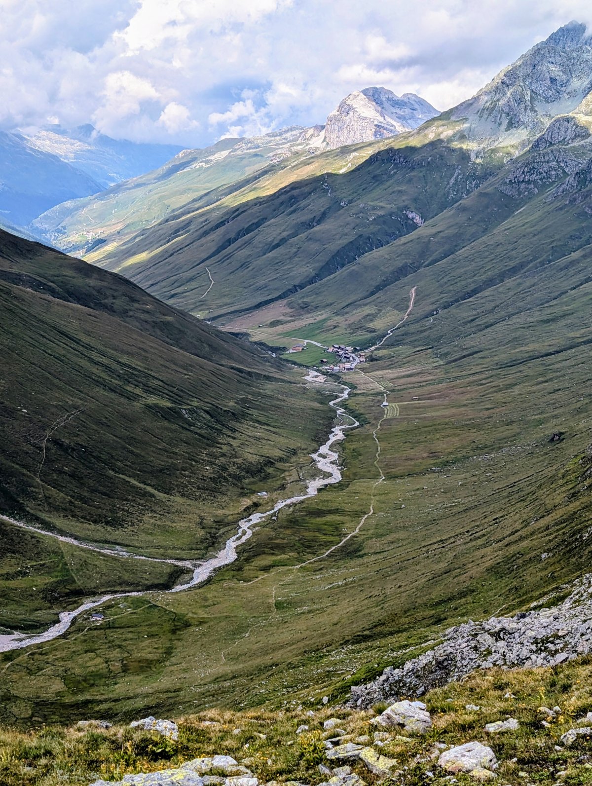 Wir werden uns zwischen zwei und drei Uhr nachmittags in Avers treffen, um dort etwas zu plaudern und die Zeit zu geniessen. So geht’s rund tausend dreihundert Höhenmeter tiefer, hinab nach Avers. Dreissig Minuten nach unserem Telefonat sehe ich bereits das Dorf Juf, welches das Hinterste im Averstals ist. Es rühmt sich zudem als höchstgelegenste Siedlung in Europa, die das ganze Jahr über bewohnt ist und liegt dabei knapp auf über zweitausend einhundert Meter über Meer.