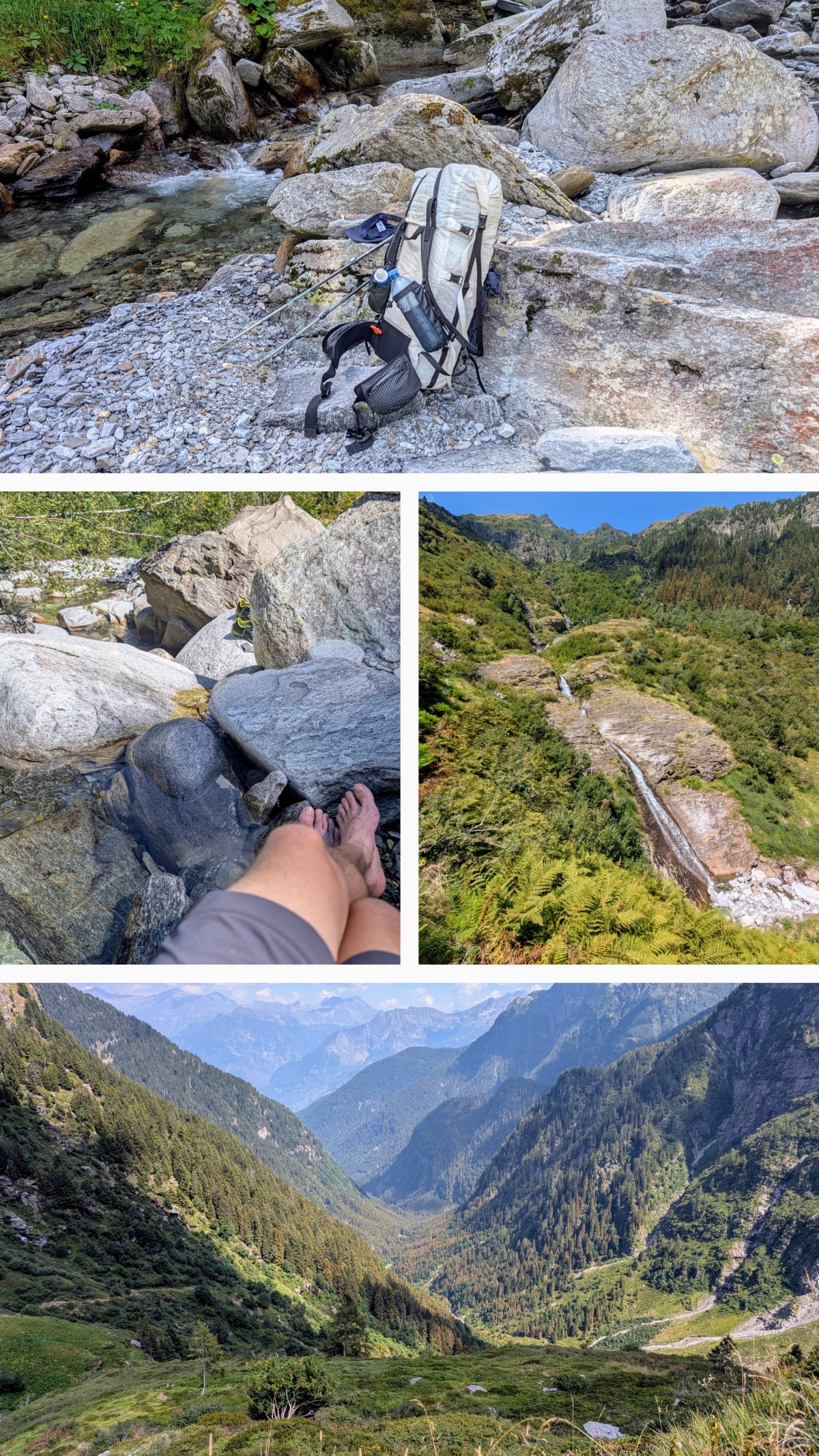 Bald darauf treffen Verena und Constantin ein und wir wandern zusammen weiter. Später gönnen wir uns bei einem Fluss nochmals eine Pause. Diesmal eine Längere, um im Schatten der Mittagssonne etwas zu entfliehen. Wir baden, essen und plaudern. Aktuelles Thema: Wo schlafen wir heute Abend? Heute keine einfach zu beantwortende Frage, denn Wildcampen auf dem Berg ist keine Option, da teils starke Gewitter angekündigt sind. Nach längerem hin und her entscheiden wir uns für die Berghütte, etwa hundert Höhenmeter unterhalb von Robiei. Ich rufe dort an, reserviere uns einen Platz und melde unser Eintreffen auf circa fünf Uhr an.