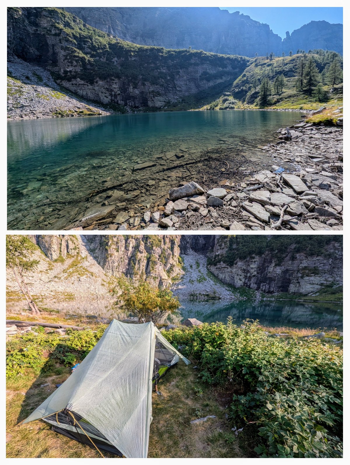 Los geht's, rund vierhundert Höhenmeter tiefer zum See. Unten am See suche ich mir einen Platz, baue mein Zelt auf und richte mich ein. Währenddessen schreibt mir Verena, wo ich diese Nacht schlafen werde. Denn eigentlich wollten Verena, Constantin und ich uns gestern in Biasca abends noch kurz auf einen Schwatz und was zu trinken treffen, doch dies passte irgendwie bei beiden nicht mehr rein.
