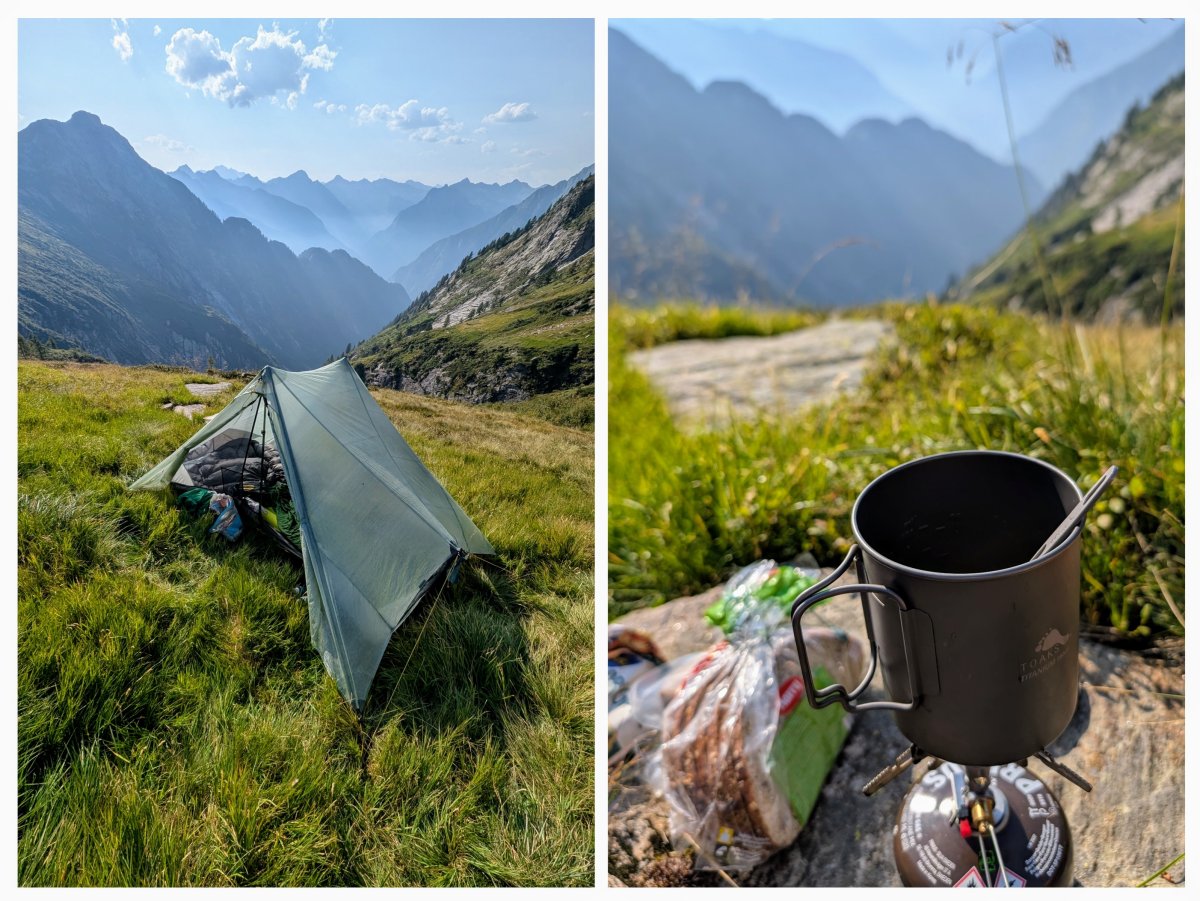 Nach einem Rast steige ich ab und entdecke hundert Höhenmeter tiefer, neben einem Geröllfeld eine teilweise ebene Alpwiese. Ich schreibe den anderen beiden, wo ich bin, stelle mein Nachtlager auf und koche mir mein Abendessen.