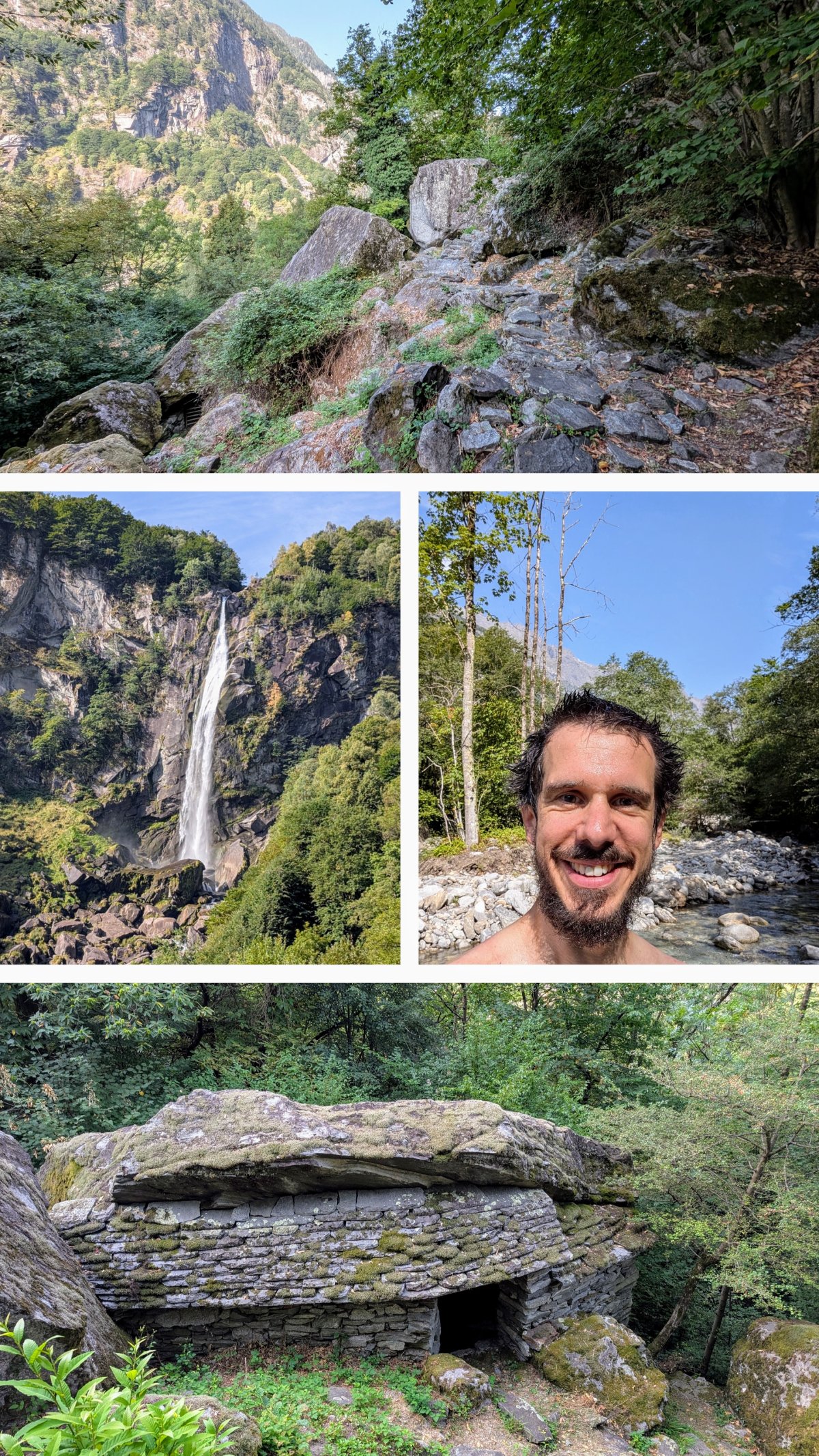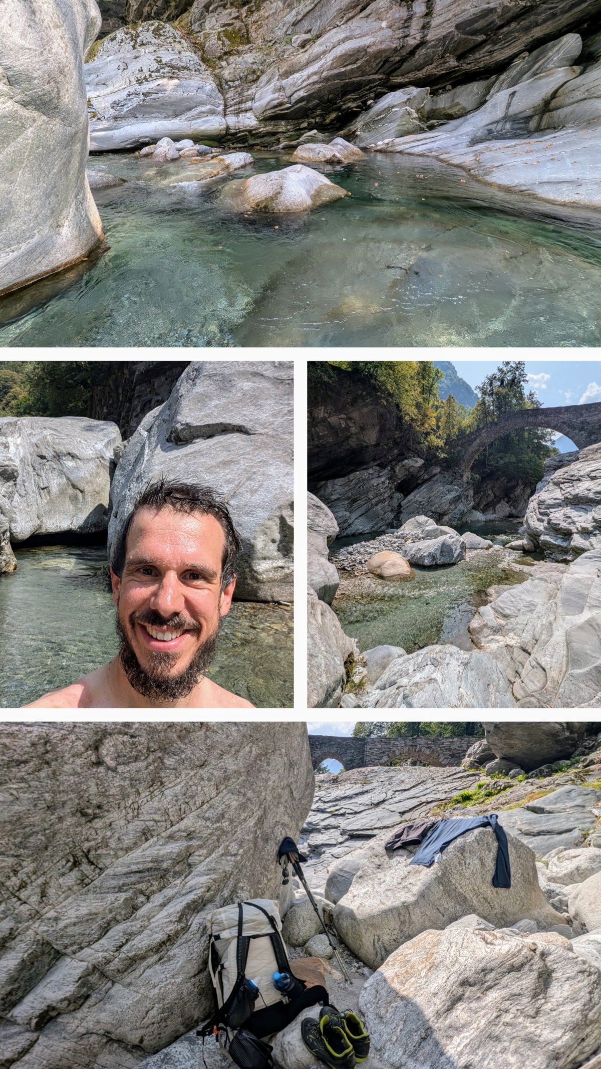 Zuerst geht’s durch Wälder auf und ab, bis ich schliesslich zur Maggia absteige und nach bereits neunzig Minuten wandern eine perfekte Badestelle finde und mich dort ins kühle Nass wage. Es ist herrlich! Ich geniesse den Moment ausgiebig und gehe gleich mehrmals baden.