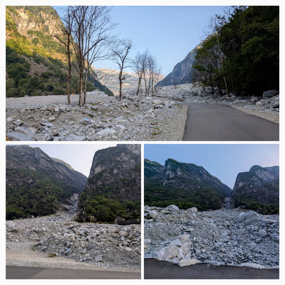 Als ich durch den Weiler Mondada laufe, macht sich das Ausmass bereits sichtbar. Weiter oben laufe ich dann über eine neu asphaltiere Strasse, wo rechts und links nichts als Geröll liegt. Ein Fels ist sogar haushoch. Beeindruckt, was für eine Gewalt da gewirkt hat, laufe ich ehrfürchtig weiter und zweige ins Dorf ab.