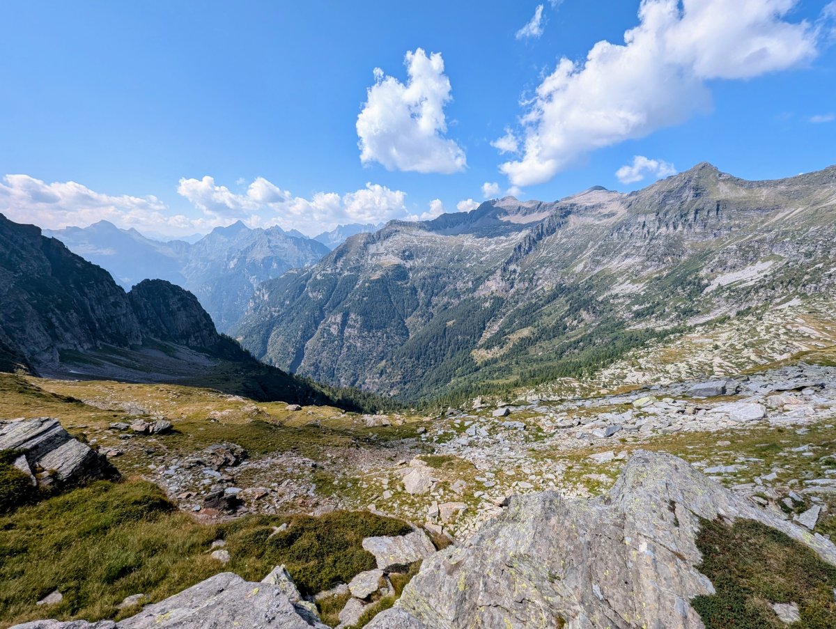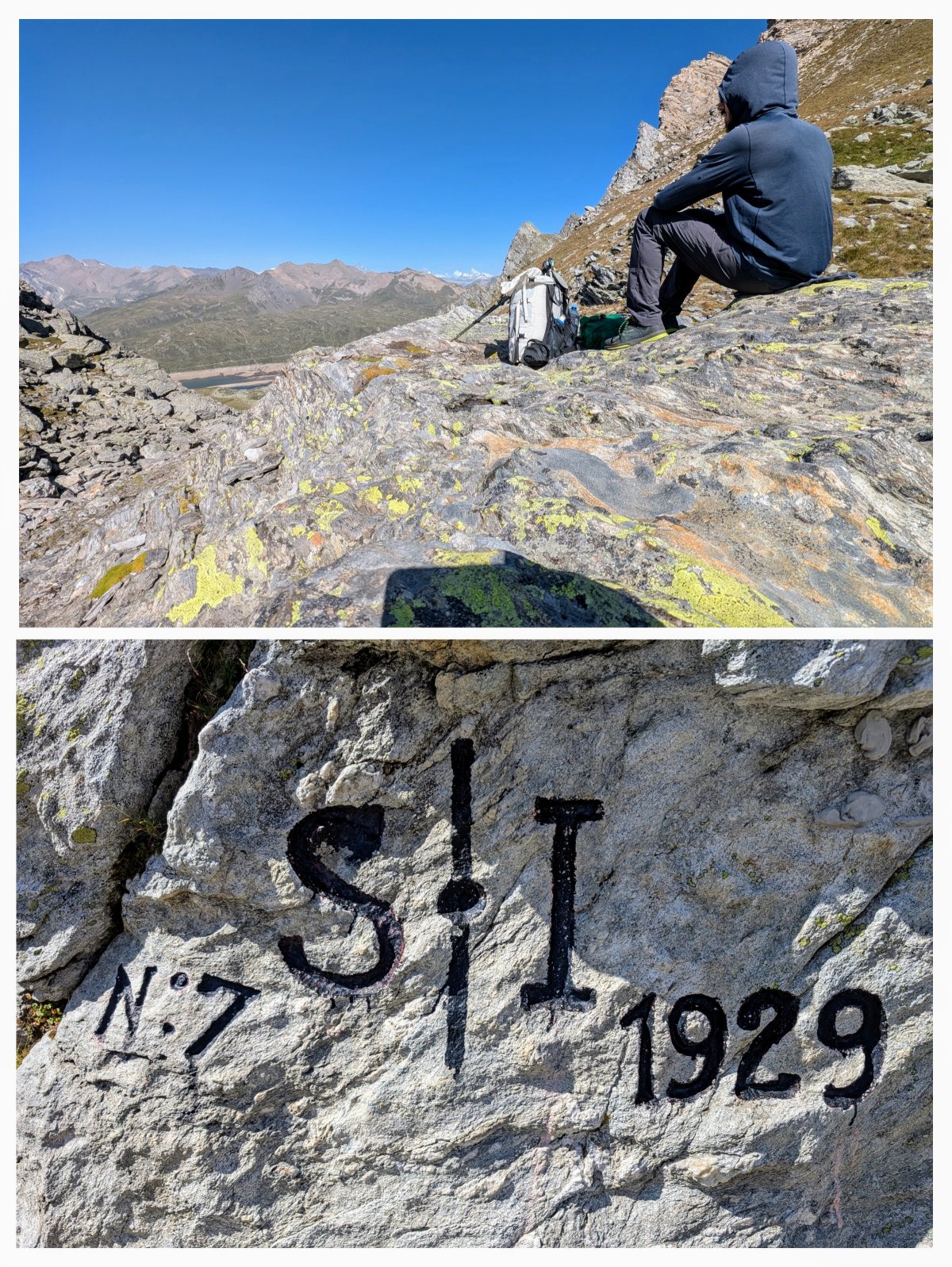 Der Weg steigt an, führt mich über Geröllfelder und rund tausend zweihundert Höhenmeter hoch zur Bocchetta und der Landesgrenze nach Italien. Oben, an der Grenze, lege ich einen ersten Rast ein, geniesse die Ruhe und snacke etwas.