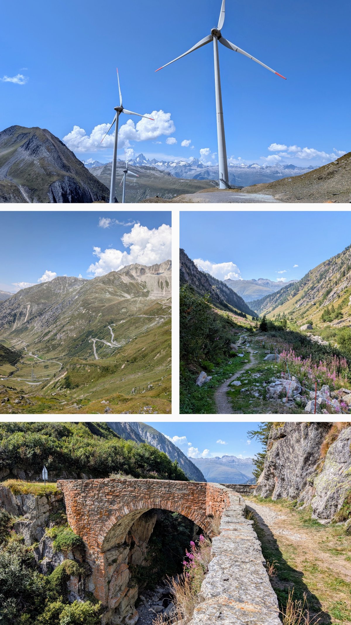 Hinab nach Ulrichen führt mich der Weg vorbei an einem Windpark und zur asphaltierten Nufenenpassstrasse. Nach einer kurzen Pause wandere ich weiter über alte Pfade und treffe kurz vor halb sechs auf dem Campingplatz ein. Ich frage nach einem freien Platz, baue mein Zelt auf und koche mein Nachtessen.