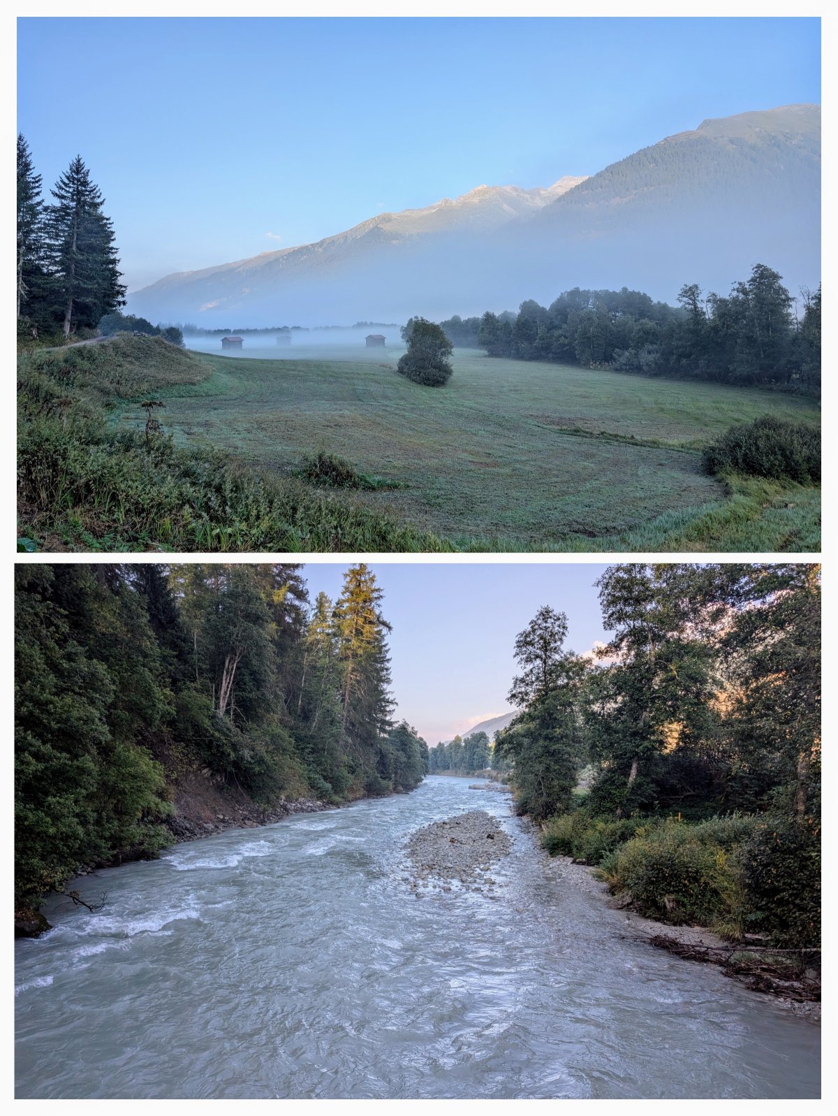 Der nächste Morgen startet bei mir kurz vor sieben Uhr. Ich packe, esse und plaudere später beim Frühstück mit den beiden. Um acht ziehe ich dann wieder alleine los, flussaufwärts nach Fontana. Ich bin gespannt, was mich dort erwartet, denn letztes Jahr kam da eine gewaltige Schlamm- und Gerölllawine den Berg herunter und riss mehrere Häuser mit.