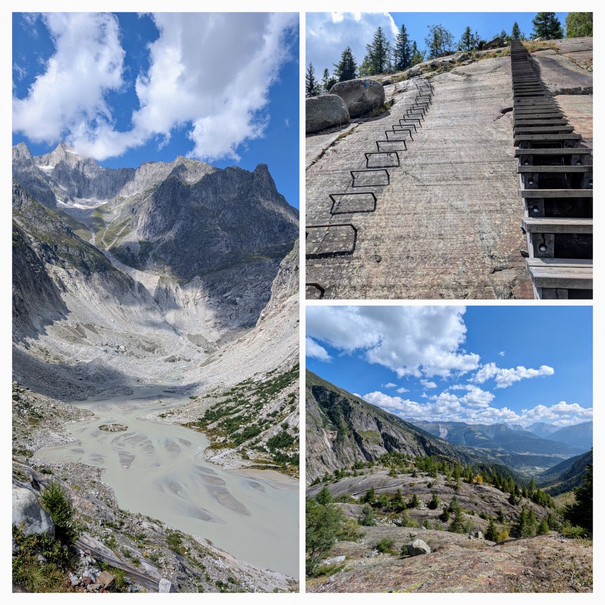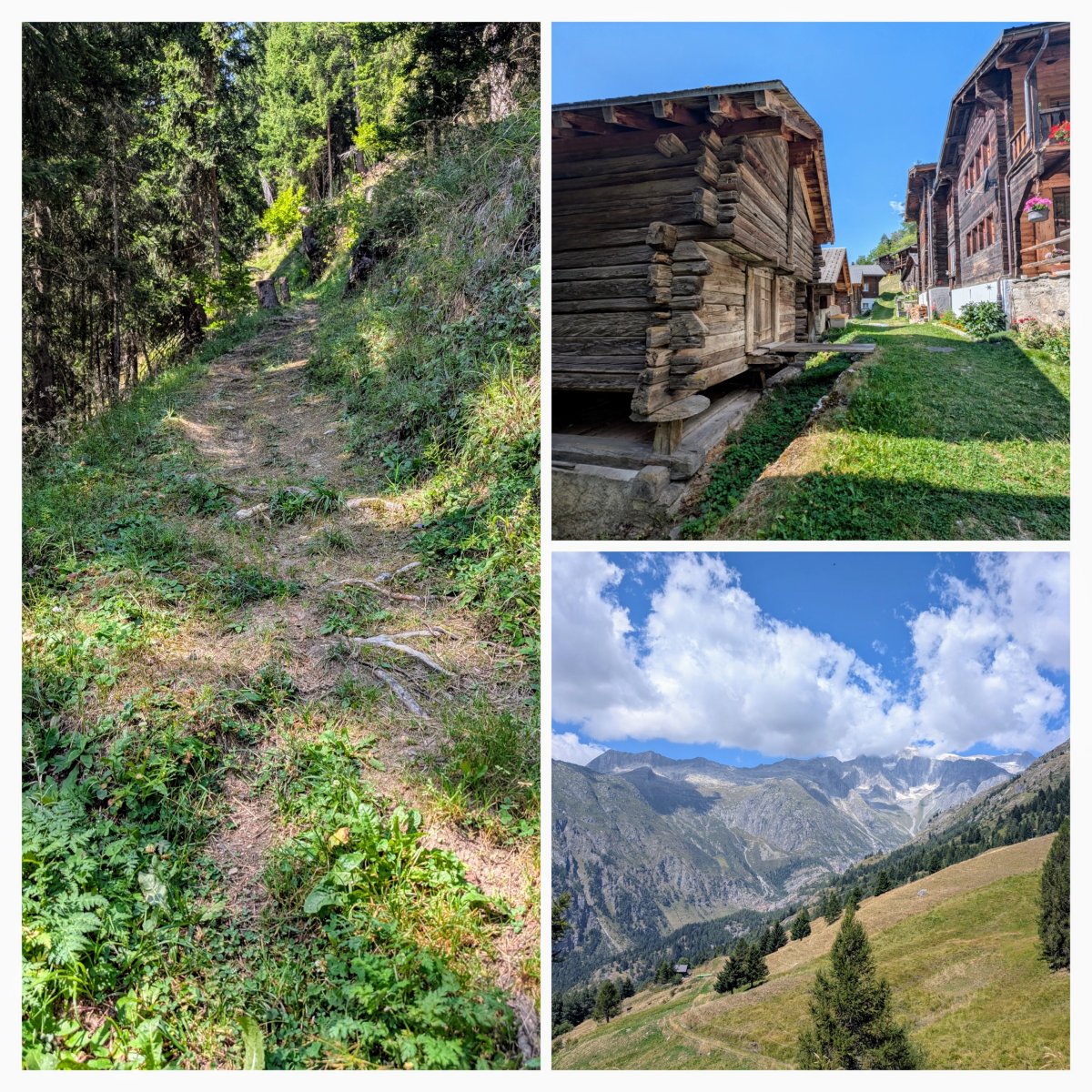 Nach der Brücke muss ich noch rund sechshundert Höhenmeter bis zu meinem Tagesziel ansteigen. Steil bergauf und vorbei an gletschergeformten Felsen. Unterwegs bergauf erfahre ich: wo heute vereinzelt Bäume wachsen, war vor hundert Jahren noch der Gletscher. Leider ist von hier unten vom Fieschergletscher heutzutage nicht mehr viel zu sehen, denn er hat sich weit nach oben zurückgezogen.