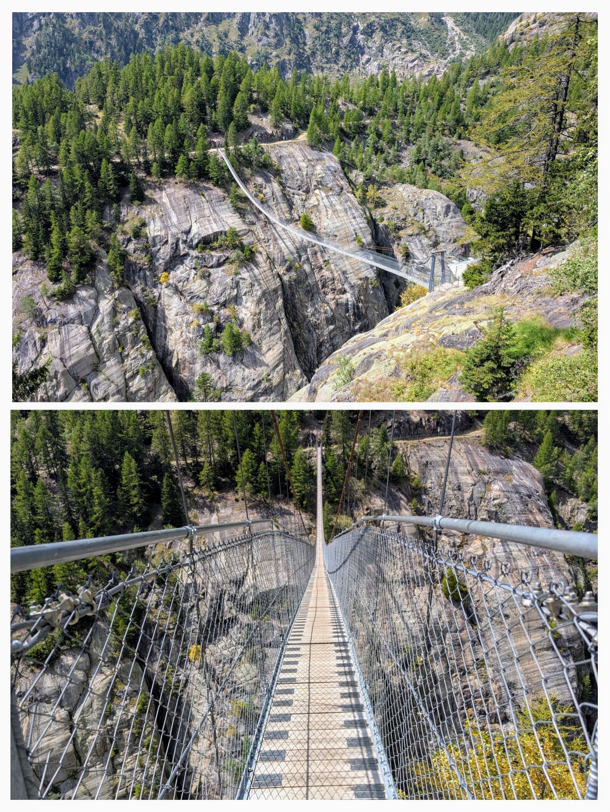 Nach einer ausgiebigen Mittagspause im Schatten und zwei Telefonaten später zweige ich ins Seitental in Richtung Fieschergletscher ab. Leicht bergab führt mich der Weg hinein ins UNESCO Weltnaturerbe Jungfrau-Aletsch. Das Tageshighlight erblicke ich kurze Zeit in der Ferne auch schon, die Aspi-Titter Hängebrücke. Auf hundertsechzig Meter Länge überspannt sie die darunterliegende “Wyswasserschlucht”. Voller Freude betrete ich die Hängebrücke und laufe bis zur Mitte. Da keine anderen Wanderer in Sichtweite sind, verweile ich ganze fünf Minuten in der Mitte der leicht schwingenden Brücke. Denn dort weht ein angenehmer kühler Wind.