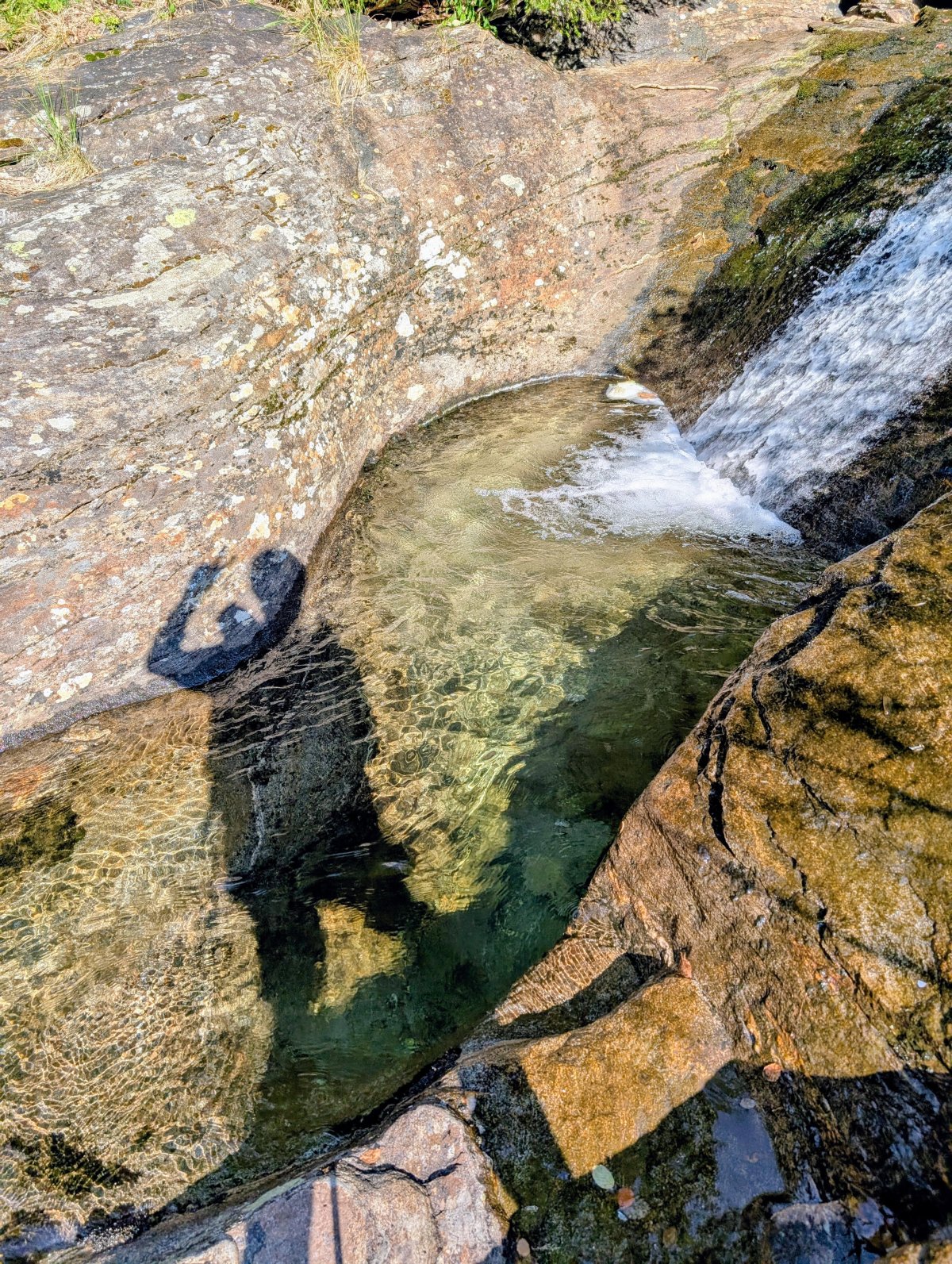 Nach meiner Mittagspause steige ich weiter auf und komme leider bald aus dem schattenspendenden Wald heraus. Die Sonne brennt unermüdlich weiter und lässt mich nur langsam vorankommen. Hier oben hat der Bach sogar eine Art Rutsche in den Stein geformt. Ich mache einen letzten Halt im Halbschatten, kühle mich im Bach herunter und fülle meine Wasserreserven auf, bevor ich die letzten achthundert Höhenmeter ohne Schatten in Angriff nehme.