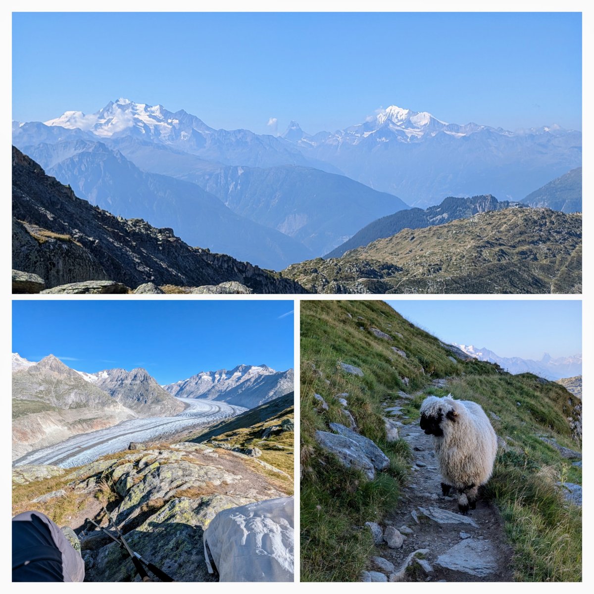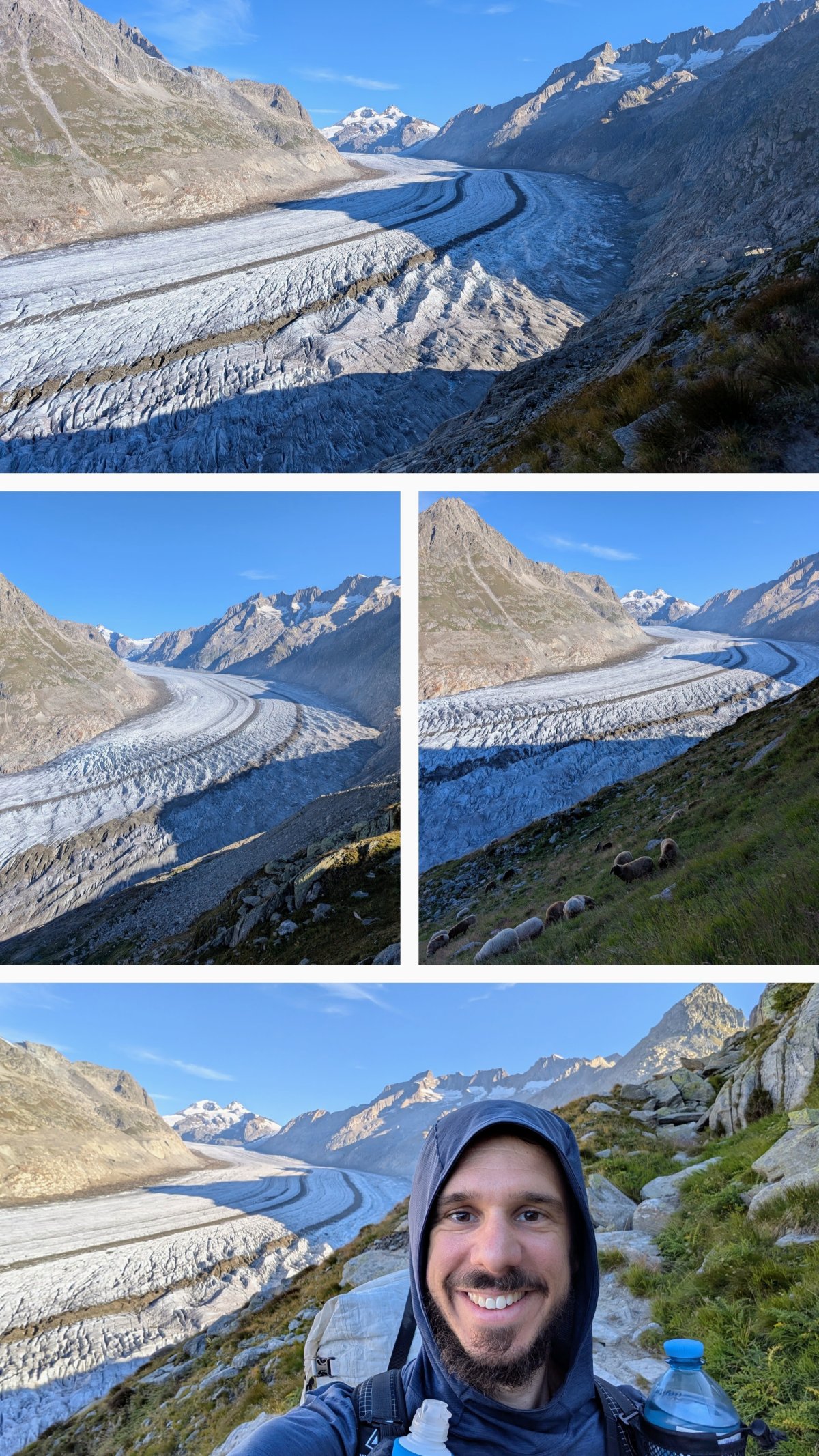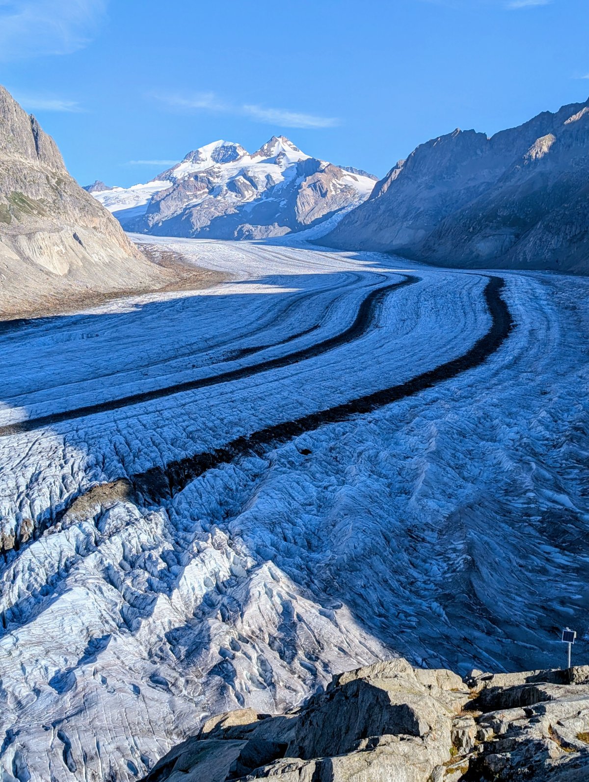Der Weg, den ich wandere, ist zugleich auch der Panoramaweg des Aletschgletschers. Immer wieder mache ich Halt, bestaune den Gletscher und beobachte, wie sich die Schatten der Berge zurückziehen und der Sonne den Platz freigeben.