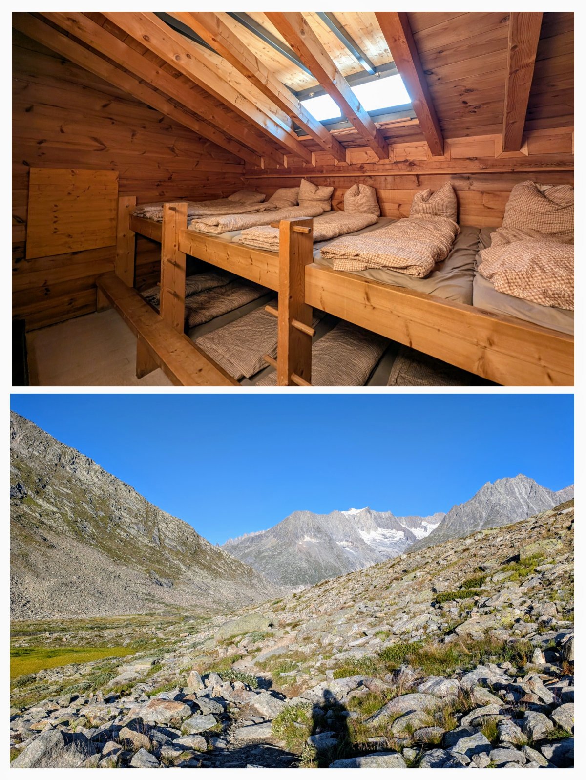 Bei strahlendem Sonnenschein starte ich in Richtung Aletschgletscher. Dieser liegt nur zwanzig Gehminuten von der Hütte entfernt, worauf ich mich besonders freue. Denn bisher habe ich den Aletschgletscher zwar bereits einmal live gesehen, doch nur aus weiter Ferne.