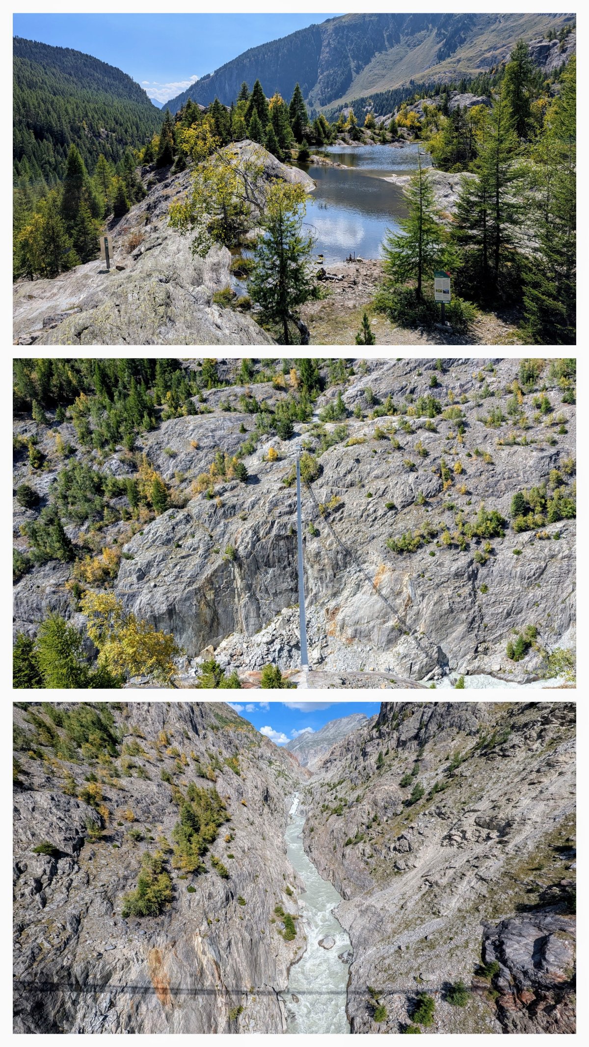 Weiter unten führt mich der Weg wieder über Felsen, die vor hundert Jahren noch von Eis bedeckt waren und dann über eine Hängebrücke über die Massa, die das Schmelzwasser des Aletschgletschers führt.