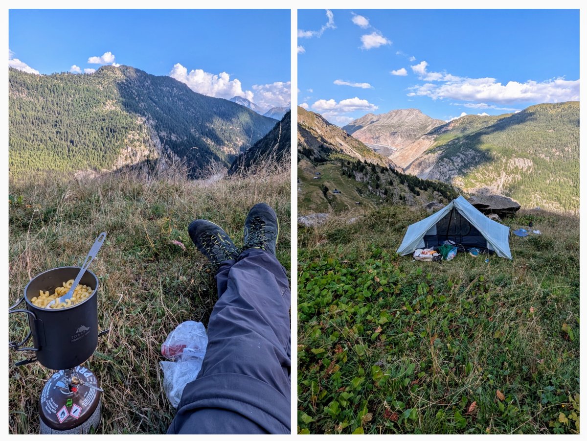 Auf der anderen Seite steige ich wieder an und suche mir dreihundert Höhenmeter weiter oben im Hang einen Lagerplatz für die Nacht. Am frühen Abend finde ich ein hübsches Plätzchen, richte mich ein und koche mir mein Abendessen. Heute gibt’s Teigwaren mit Landjäger und Gemüse. Nach dem Essen vergesse ich etwas die Zeit und will mich circa eine Stunde vor Sonnenuntergang für die Nacht einrichten.