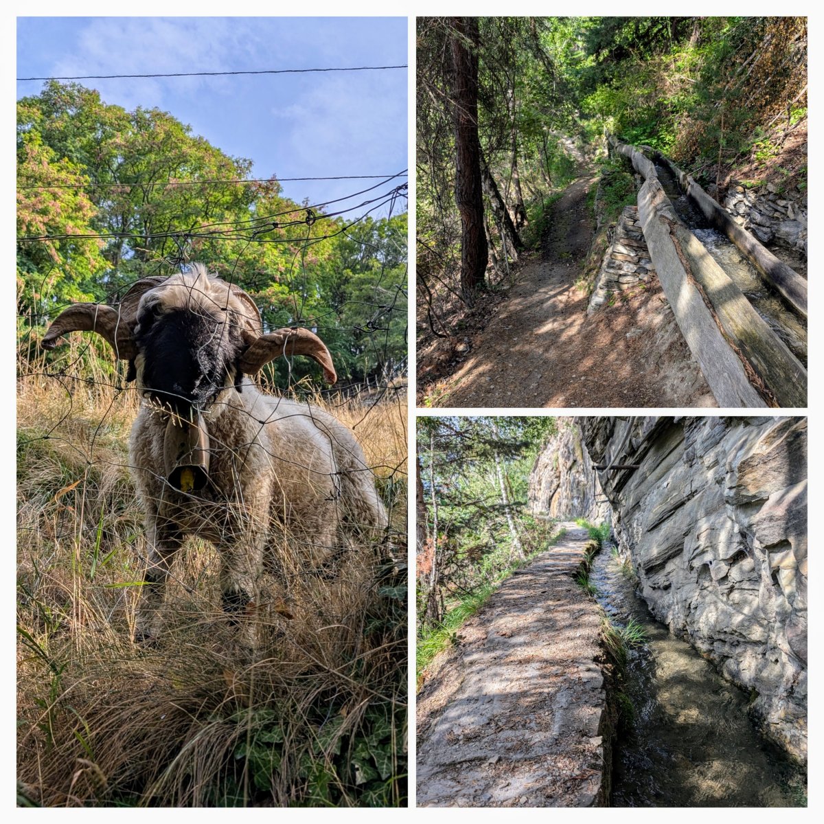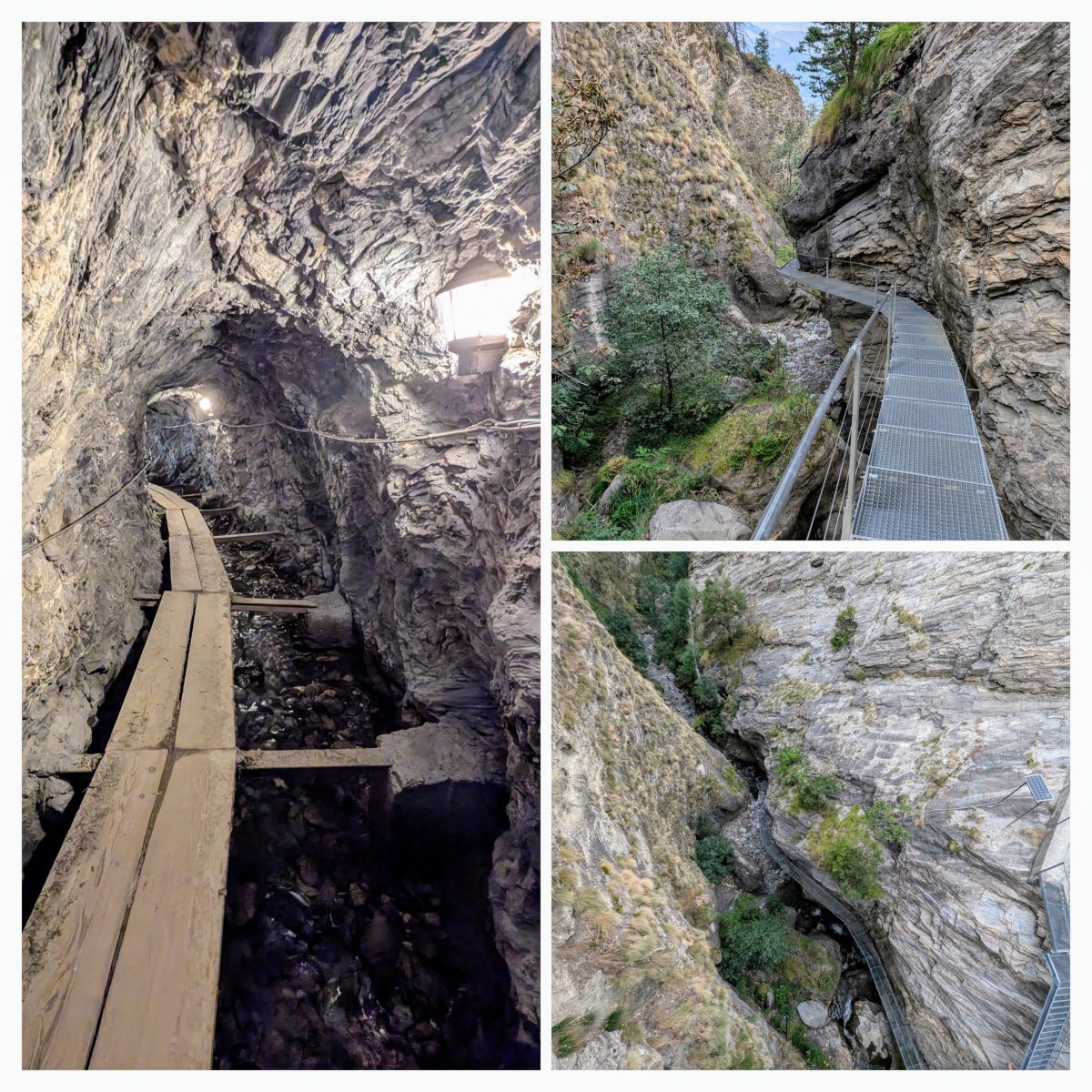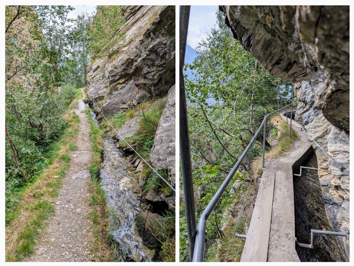 Weiter vorne geht's wieder an die frische Luft. Dort finde ich dann auch heraus, warum der eine Teil des Jolibachs hier durch den Felsen fliesst. Das Wasser wird dem Bach entnommen und speist eine Suone. Ich steige weiter ab, verlasse die Suone und komme am späteren Nachmittag in Gampel auf dem Campingplatz an.