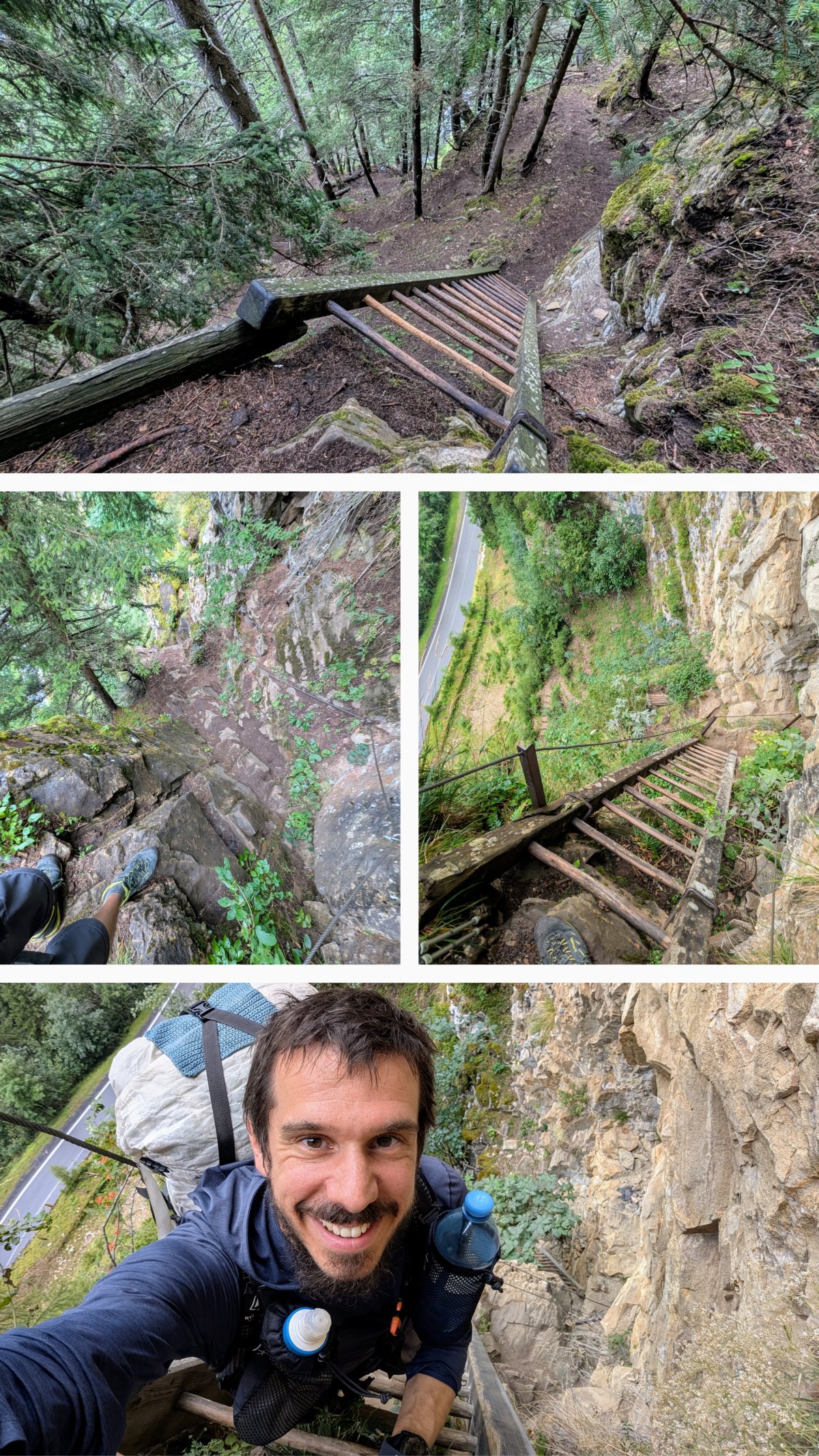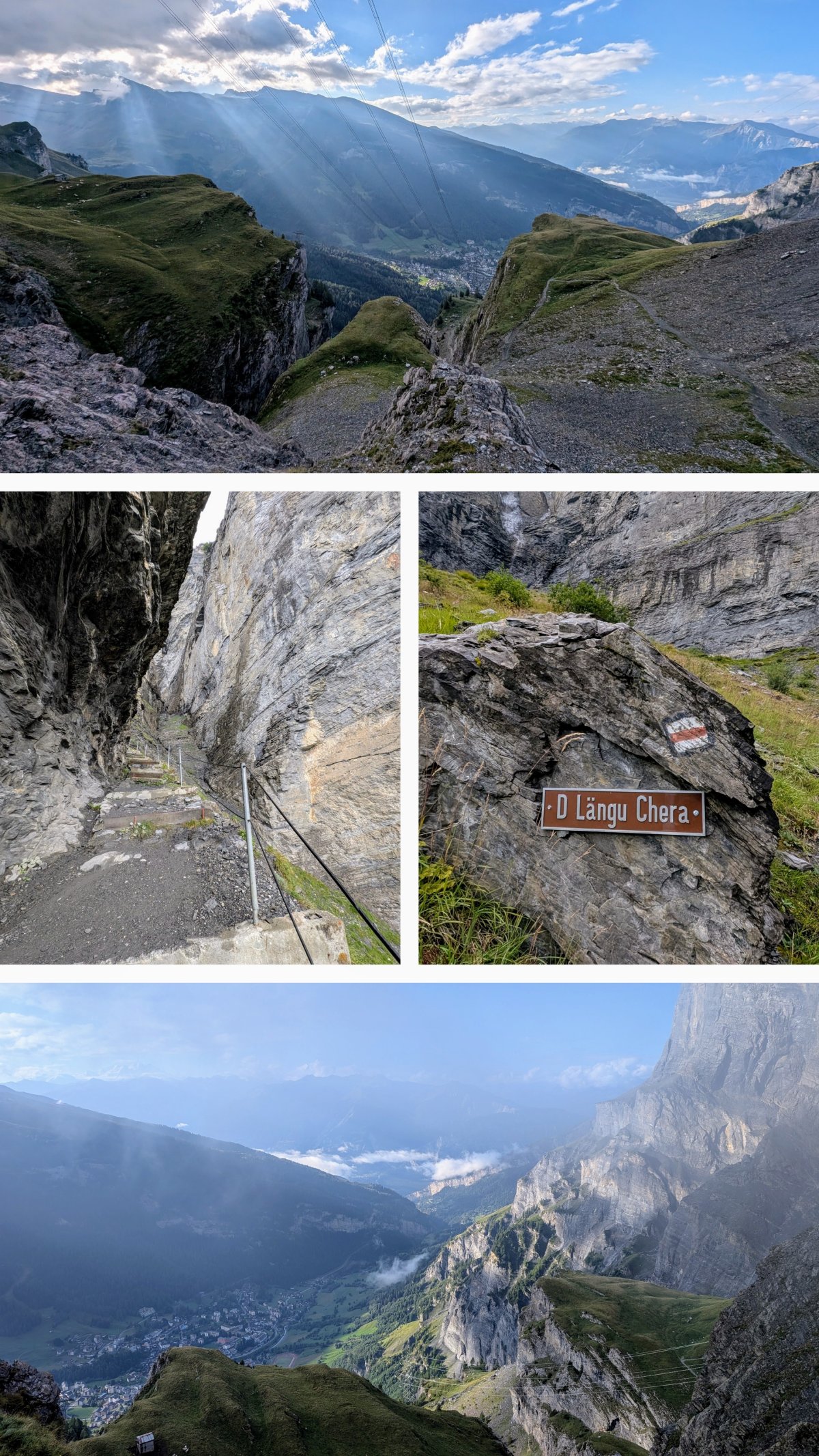 Wolkenverhangen wandere ich immer weiter nach hinten ins Dalatal hoch nach Leukerbad. Insgesamt eher unspektakuläre Wege. Doch wie so oft wird es gegen Ende hin spannend. Vor mir stehen Warnhinweise “Nur für Schwindelfreie”. Gespannt, was denn da kommt, treffe ich auf steile Abhänge und rutschige Holzleitern. Mit Freude taste ich mich die letzten Meter nach Leukerbad hinunter und treffe zufrieden am späteren Nachmittag in Leukerbad ein.