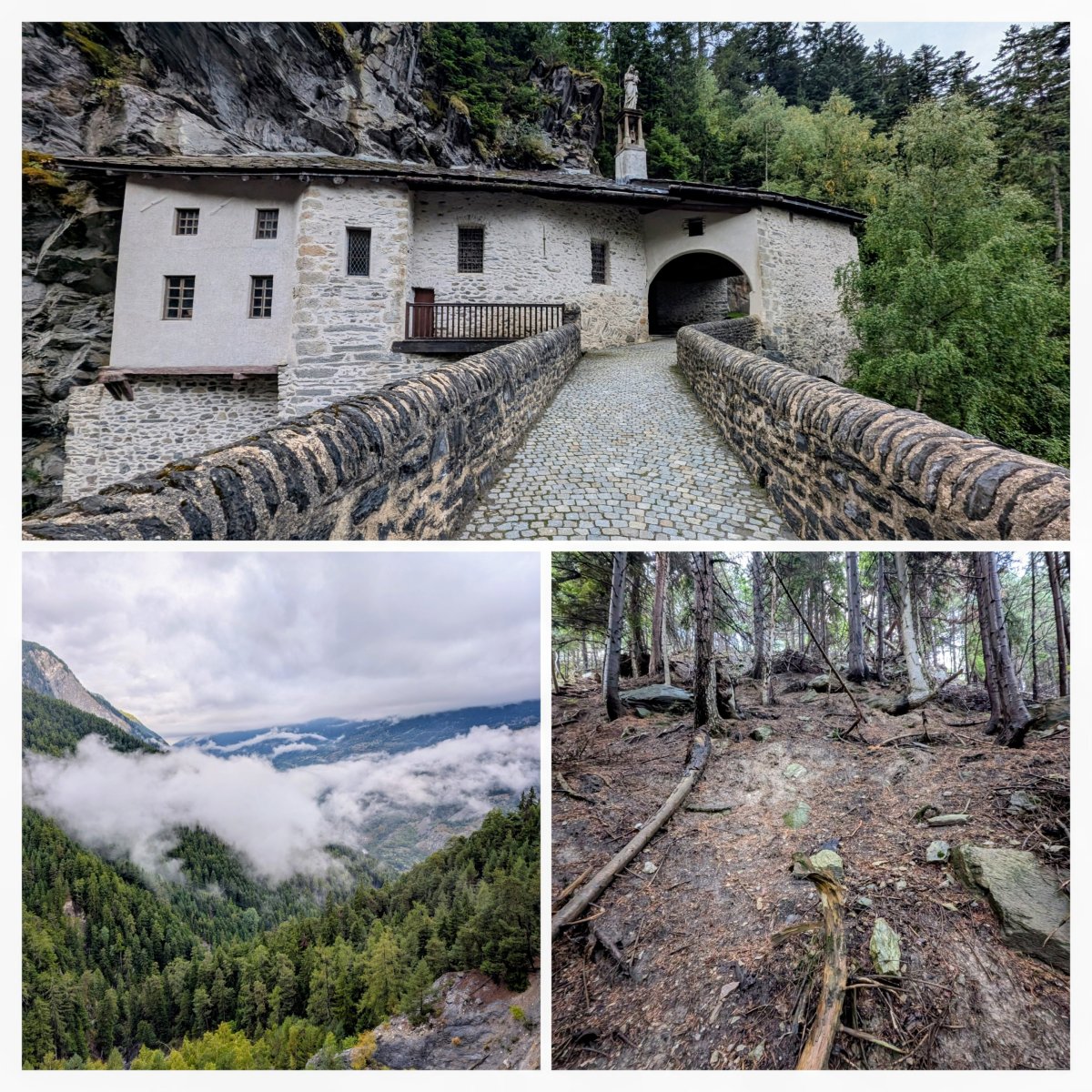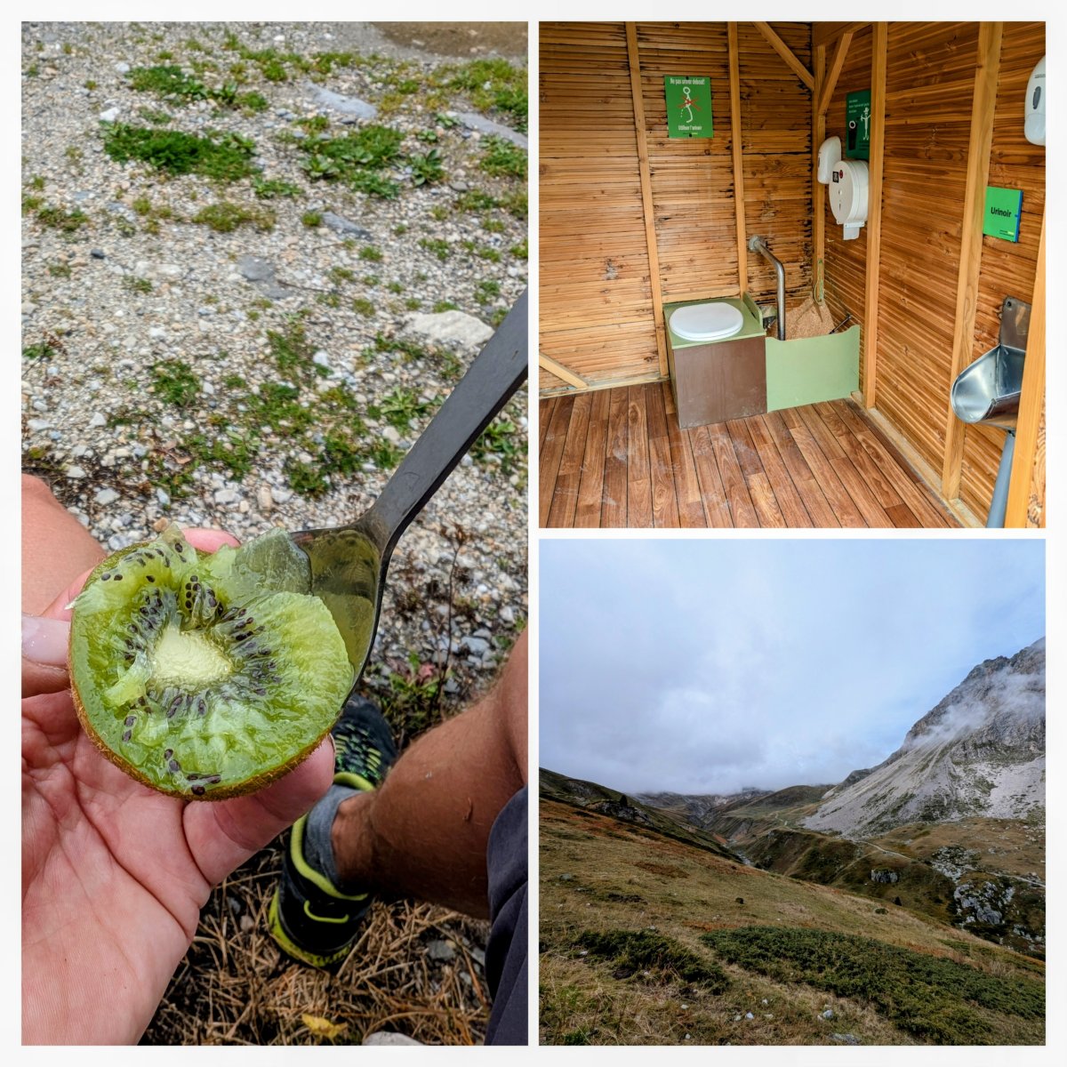 Unterwegs bergauf muss ich nach rund einer Stunde bereits einen Umweg laufen, da meine geplante Route von einem Unwetter vom 30. Juni weggeschwemmt wurde. Entlang des Weges stosse ich irgendwo im nirgendwo auf eine Öko-Toilette, die vermutlich für Wanderer gedacht ist. Weiter oben lege ich eine Vitaminpause ein und geniesse meine Kiwi.