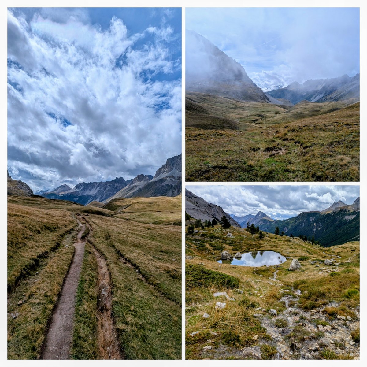 Der Himmel ist stark bewölkt und zwischendurch regnet es sogar leicht. Ich komme gut voran und bin fast Punkt zwölf Uhr mittags auf dem heute höchsten Punkt dem “Col de Buffère” auf rund zweitausend vierhundert Meter über Meer. Zugleich, als ich oben ankomme, reisst die Wolkendecke auf und ich kann in meiner Mittagspause die wärmenden Sonnenstrahlen geniessen.