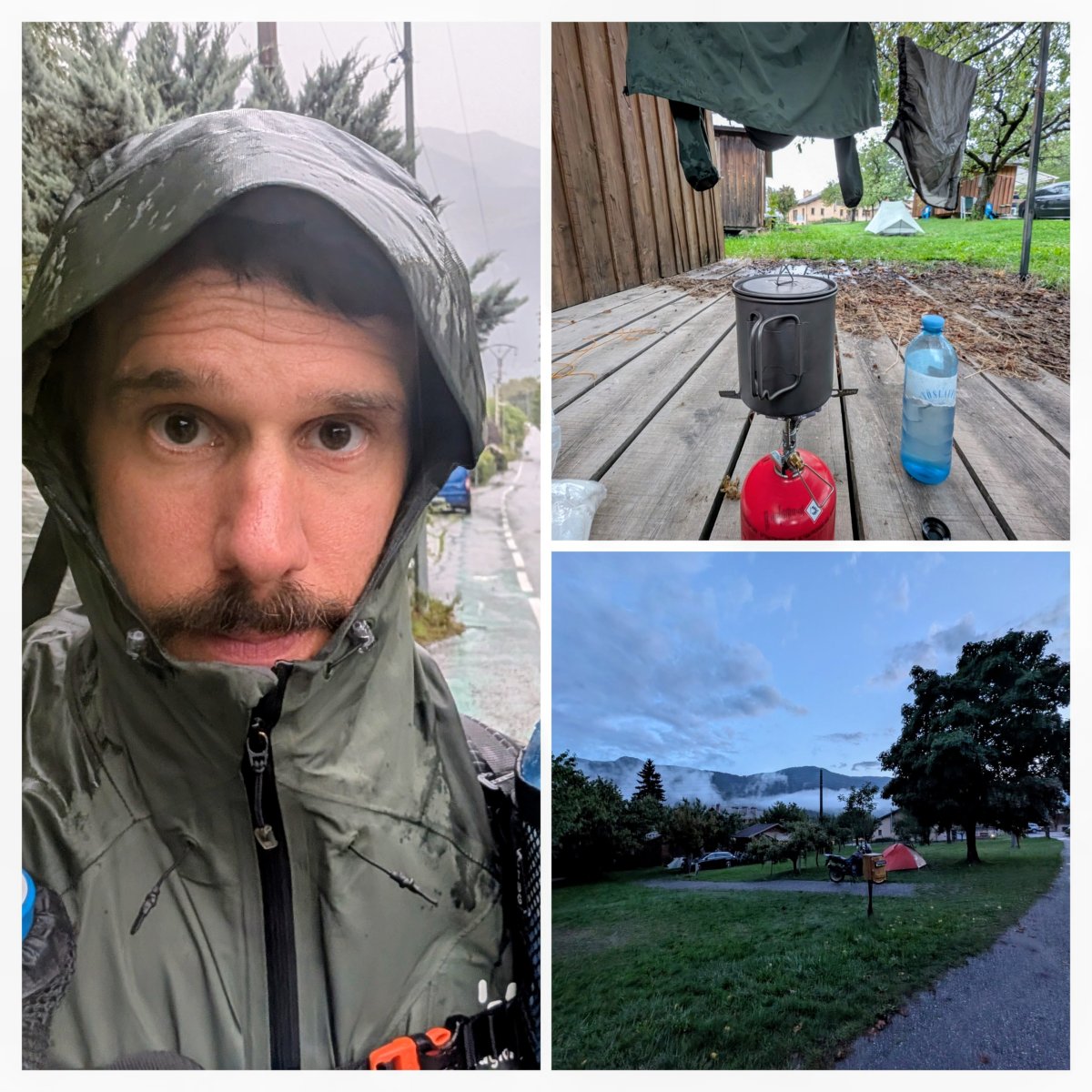 Nach einer knappen Stunde im Regen treffe ich beim Hotel ein, checke fürs Camping ein und baue mein Zelt auf. Später koche ich mir mein Abendessen bei einem Unterstand und gehe kurz nach Sonnenuntergang schlafen.