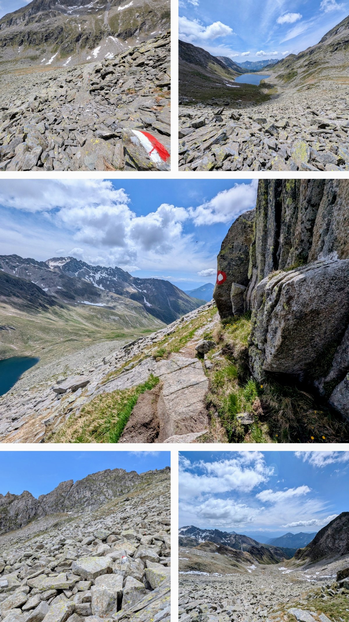 Der heutige Weg führt mich über zwei Scharten hinab in ein Tal und dann aufs Pitsch-Joch hinauf. Die beiden Scharten, die ich heute queren werde, sind normale Wege ohne Kletterpassagen.