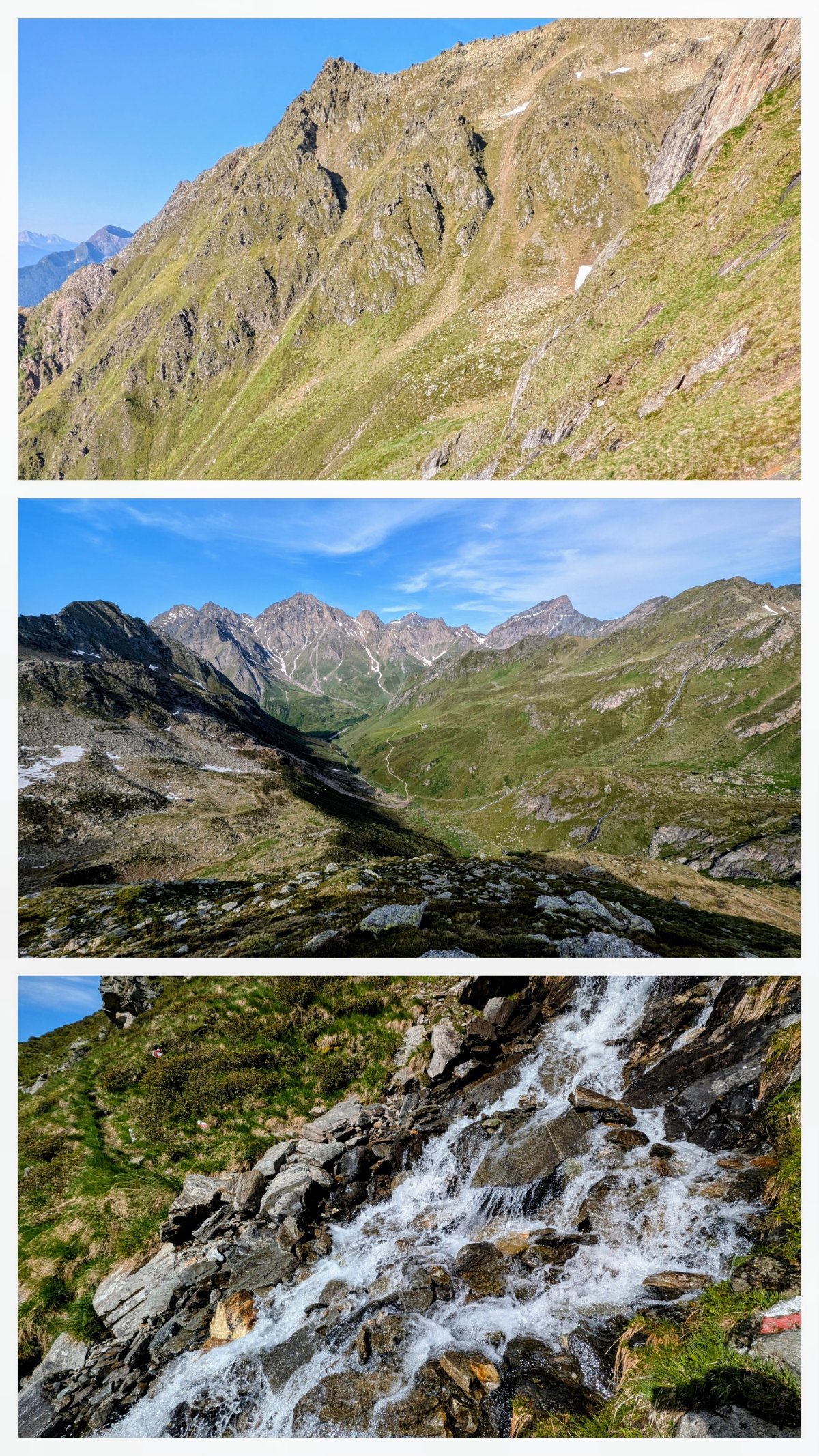 Zuerst steigt der Weg steil zur ersten Scharte hoch und dann wieder leicht bergab. Wieder führt mich der Höhenweg durch wilde Bäche, die ich teilweise nur weiter oben sicher queren kann.