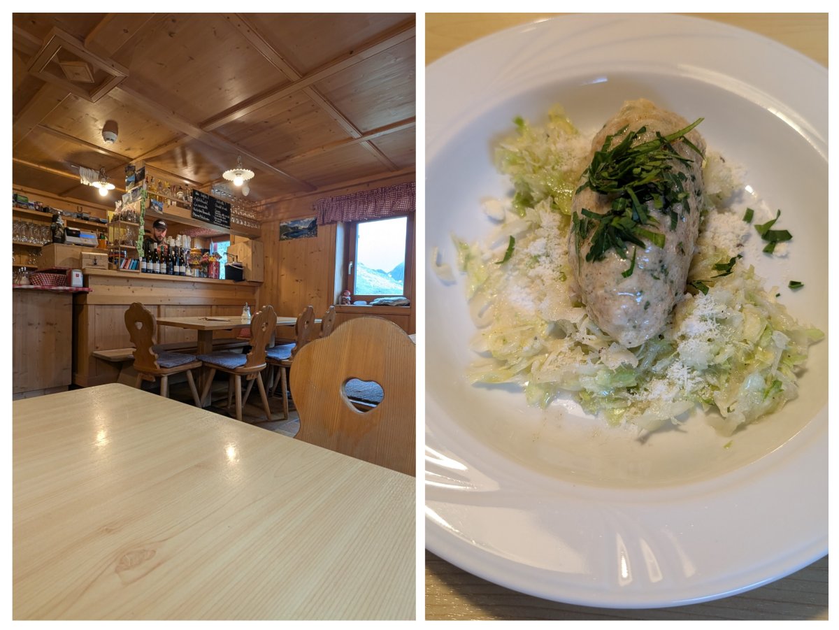 Nach einem kräftezehrenden letzten Abschnitt erreiche ich dankbar die Hütte und melde mich beim Hüttenwirt Roland. Er empfängt mich herzlich und zeigt mir alles auf seiner Hütte. Obwohl noch fünf andere Gäste hier sind, habe ich das Matratzenlager wieder ganz alleine für mich. Ich richte mich ein, gehe später runter in die Gaststube, trinke ein “Hefele” und komme mit Roland und seiner Familie sowie den anderen Gästen ins Gespräch.