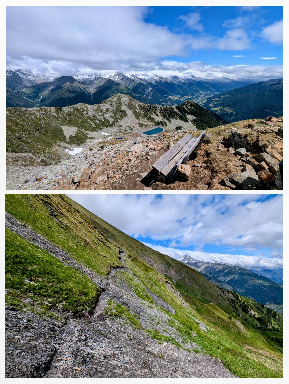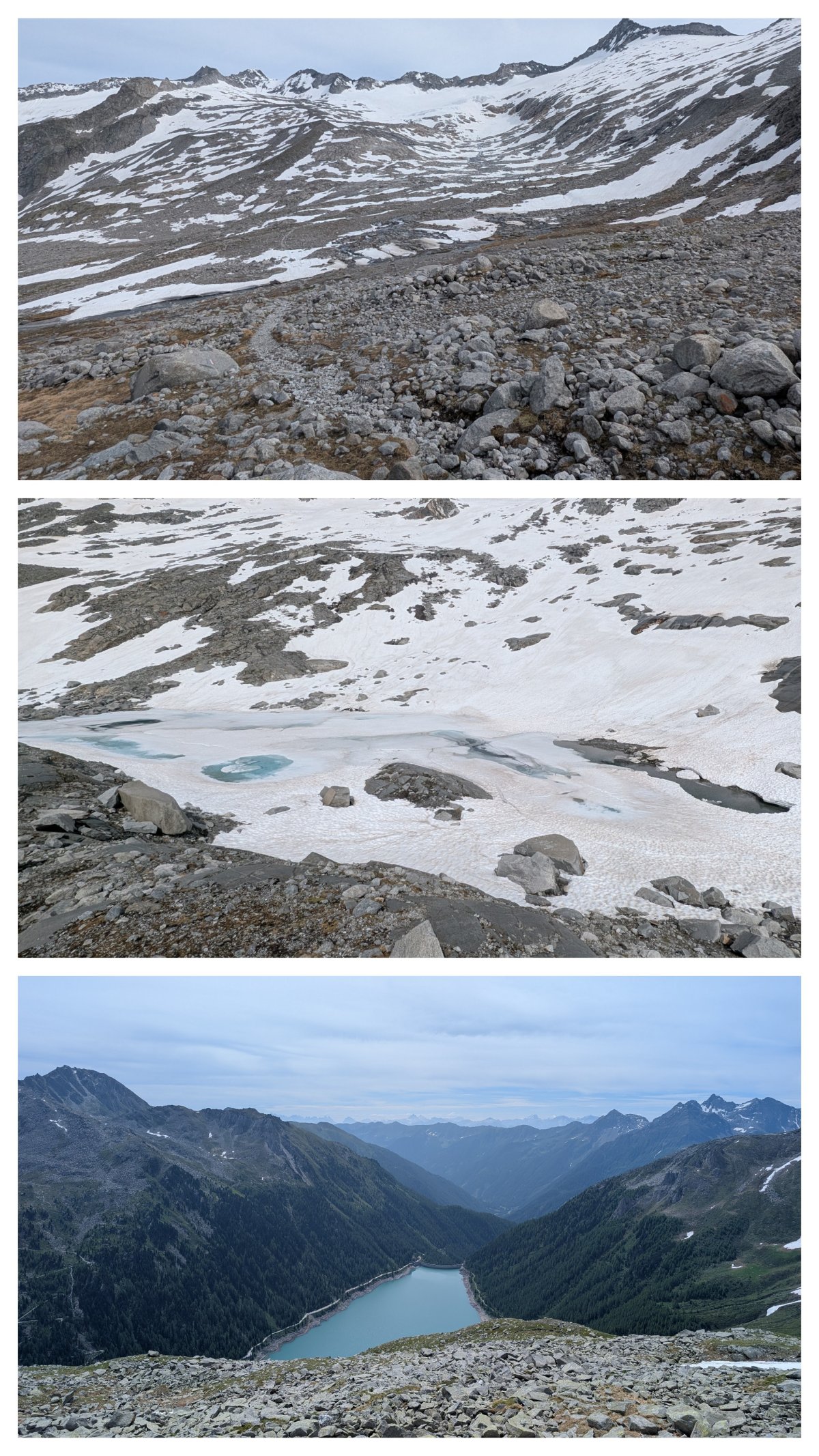 Doch zuerst muss ich tausend achthundert Höhenmeter und knappe dreissig Kilometer hinter mich bringen. Der Weg ist gut begehbar und führt mich langsam bergab. Kurz nach dem Verlassen der Hütte überquere ich die Grenze nach Österreich. Da kommen mir auch bereits die ersten Wanderer und Biker entgegen, die vermutlich unten beim Stausee ihr Auto geparkt haben.
