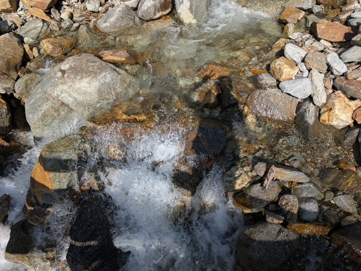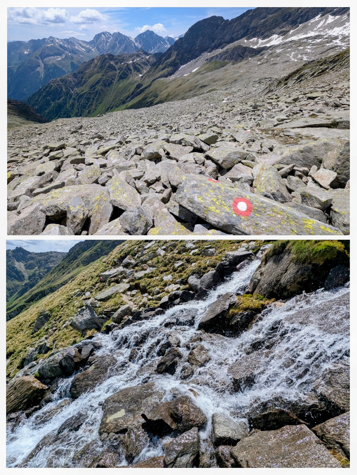 Die Scharte ist sehr schmal und führt mich auf der anderen Seite über Felsbrocken, Geröll und Bäche leicht bergab.