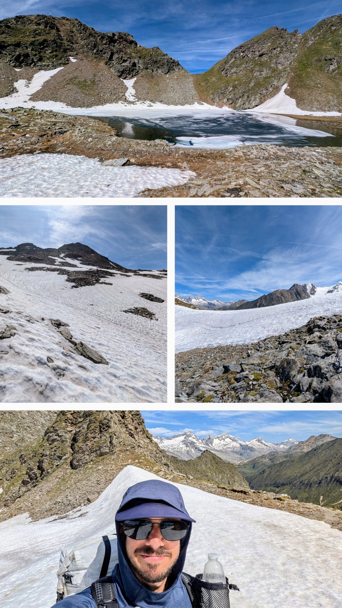 Auf dem Aufstieg zur zweiten Scharte treffe ich auf Schnee. Widerwillen kreuze ich die Altschneefelder und umgehe diese, wo möglich. Ich bin immer noch leicht verspannt von der Nacht, müde und spüre zunehmende Kopfschmerzen.
