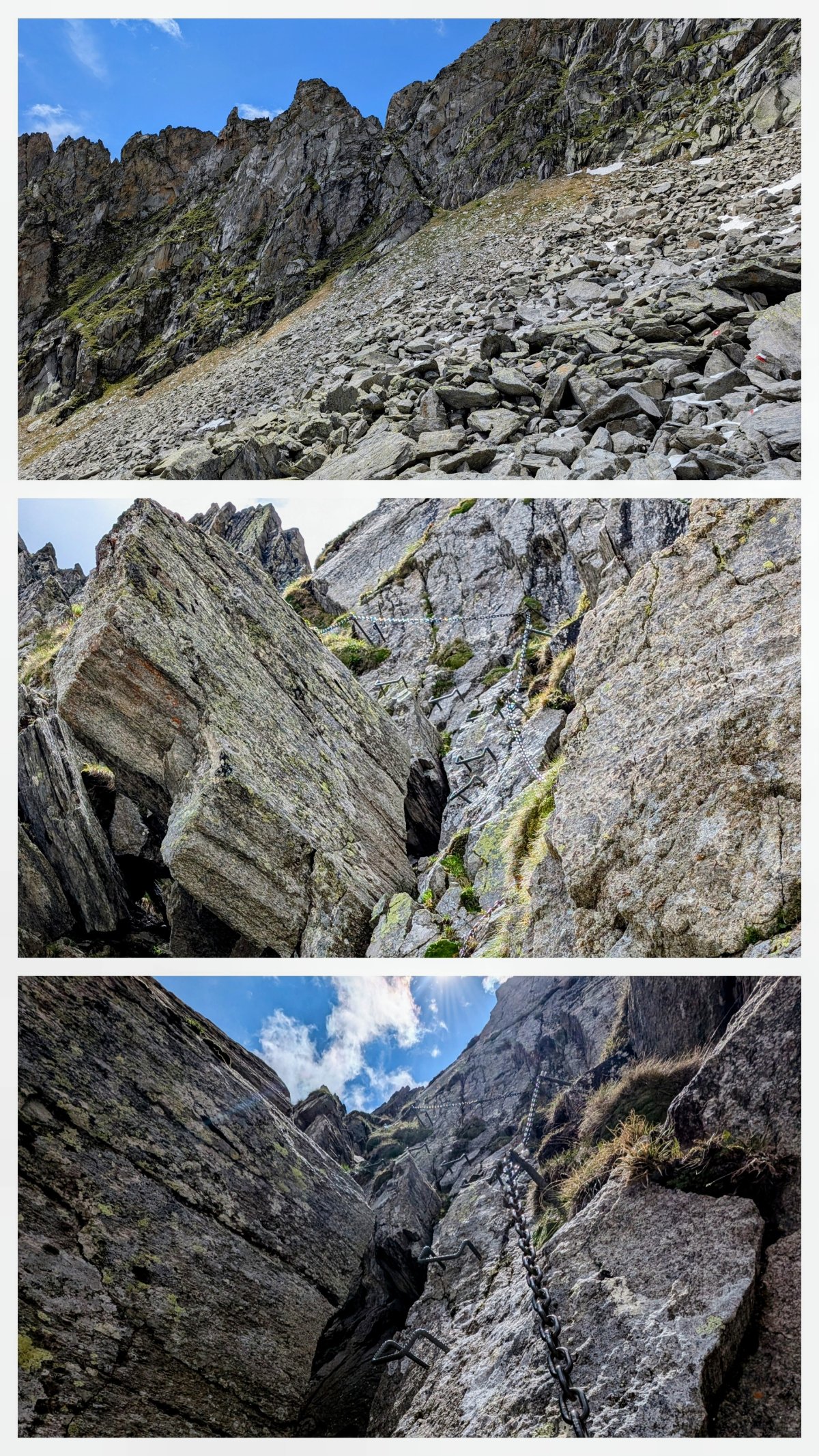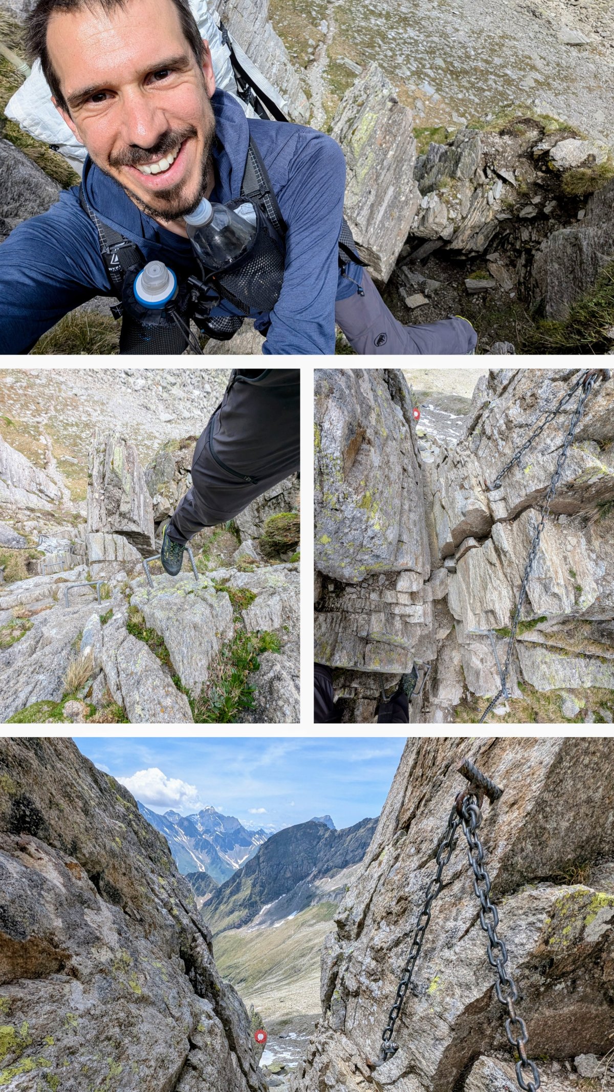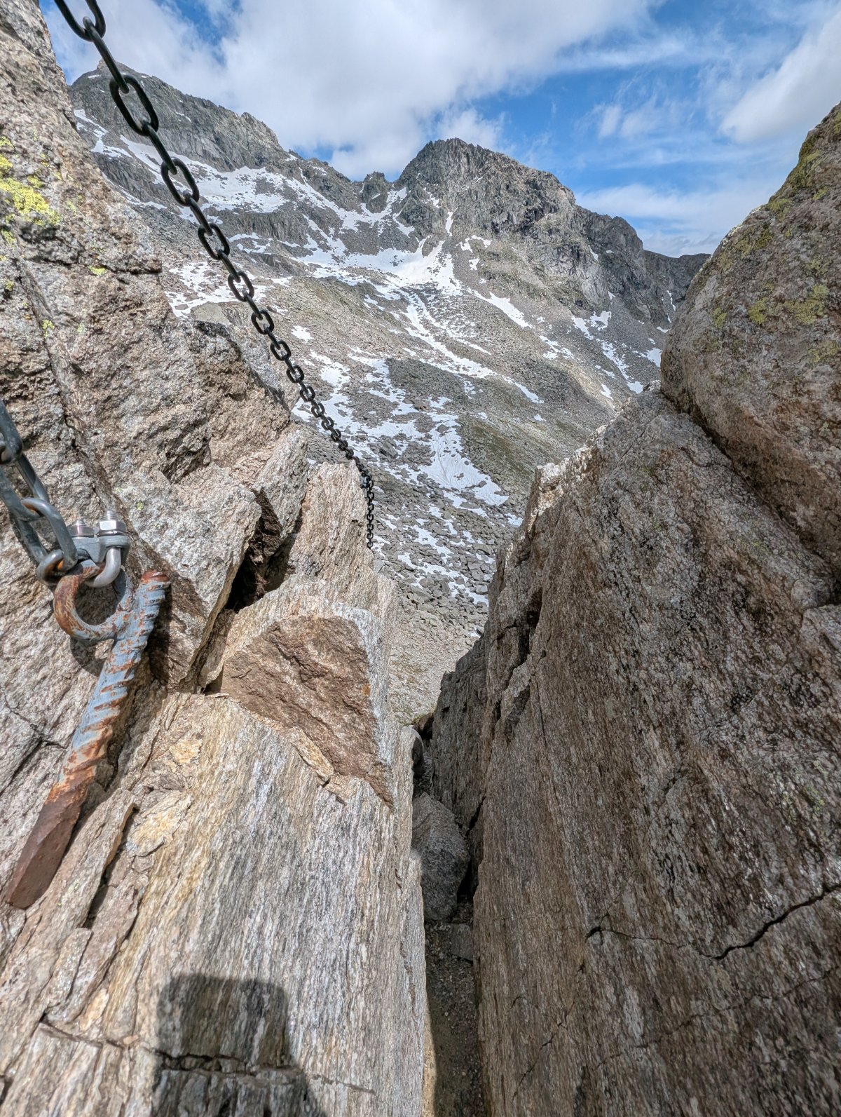Voller Vorfreude prüfe ich kurz, ob alles an meinem Rucksack sitzt und klettere die Scharte hoch. Der Weg, oder eben die Kletterpassage, ist mit einer Kette gesichert und dient mir als Steighilfe. Nach weniger als fünf Minuten bin ich bereits oben, blicke hinunter durch die Scharte auf die andere Seite und geniesse den Moment.