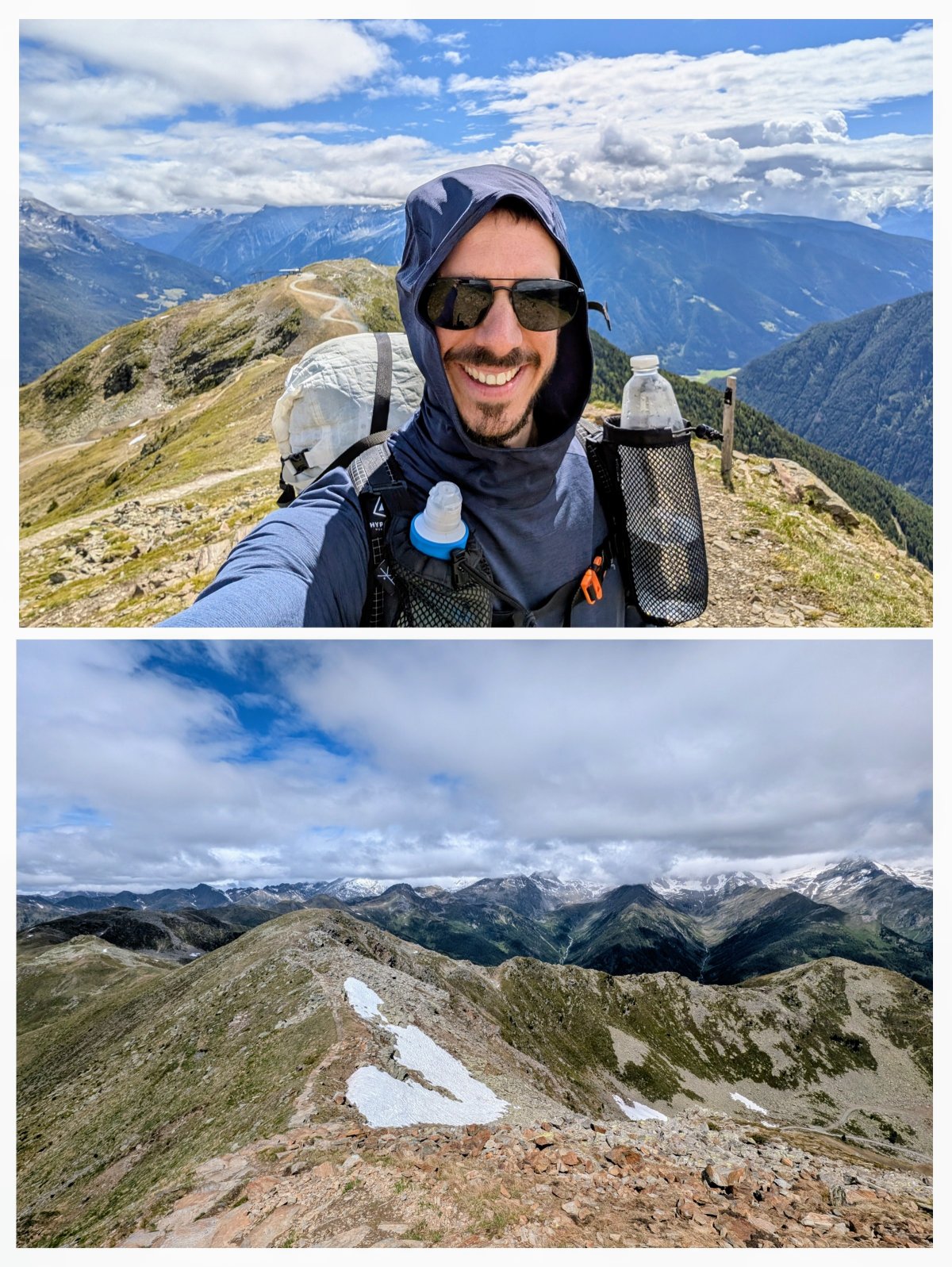 Mal geht’s links, mal rechts vom Grat entlang. Immer tauchen wieder neue Bergspitzen auf. Es fühlt sich an wie ein nicht enden wollender Weg.