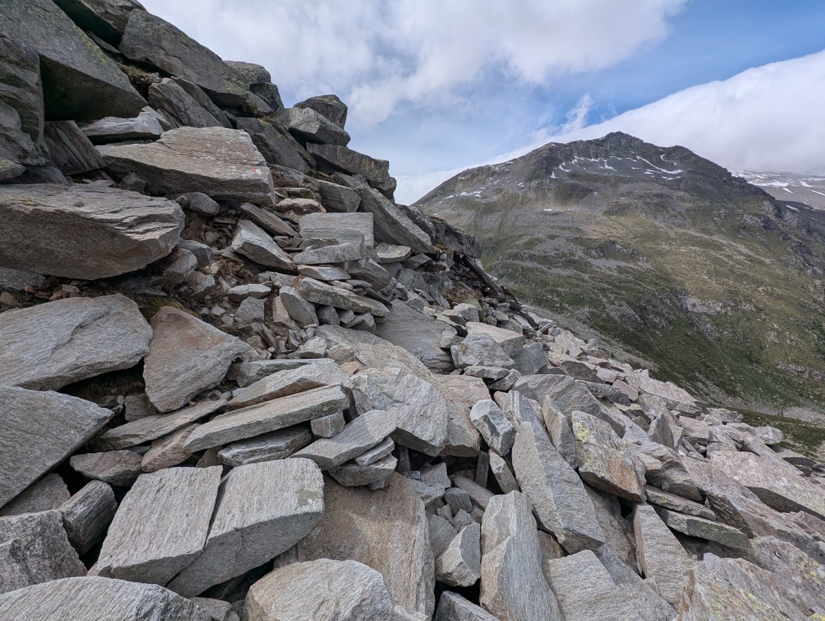 Rund zwei Kilometer vor meinem heutigen Ziel wird's dann noch anspruchsvoll. Es geht über ein grosses Geröllfeld mit teilweise über einem Meter grossen Felsbrocken. Dabei warnt mich ein Schild vor Steinschlag und ermahnt für zügiges Vorangehen. Leider verliere ich immer wieder die Markierungen aus dem Auge und komme oft vom Weg ab, so dass ich mühsam über grosse Felsbrocken steigen muss, um irgendwie wieder den Weg zu finden.