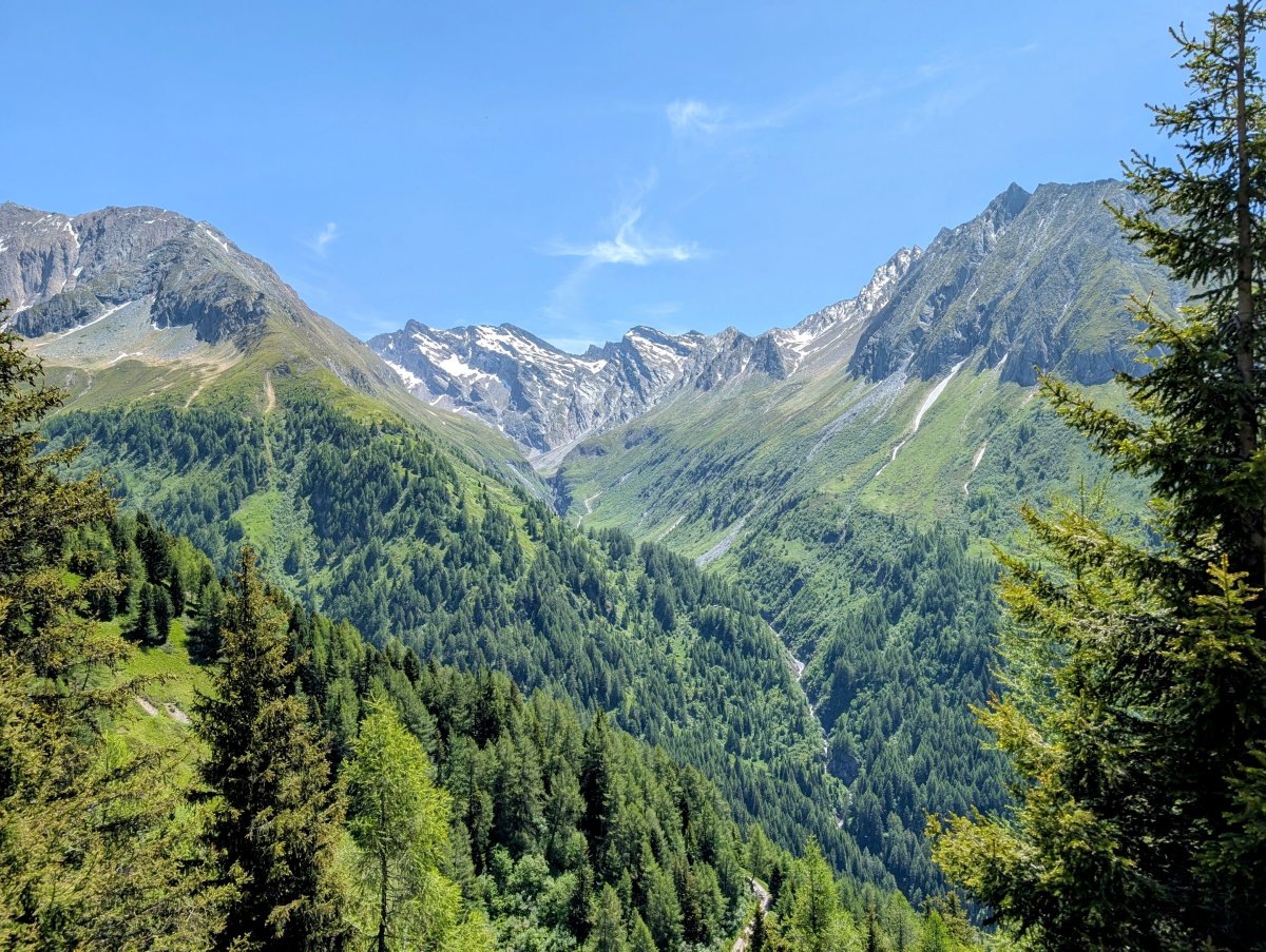 Unterwegs biege ich wieder in die “richtige” Via-Alpina ein und bin sozusagen wieder "back on track”. Beim Aufstieg zur Hütte erhasche ich, mit einem Blick zurück durch den Wald, nochmals die zweite Scharte, die ich oben bei den schneebedeckten Spitzen in der Ferne überquert habe.